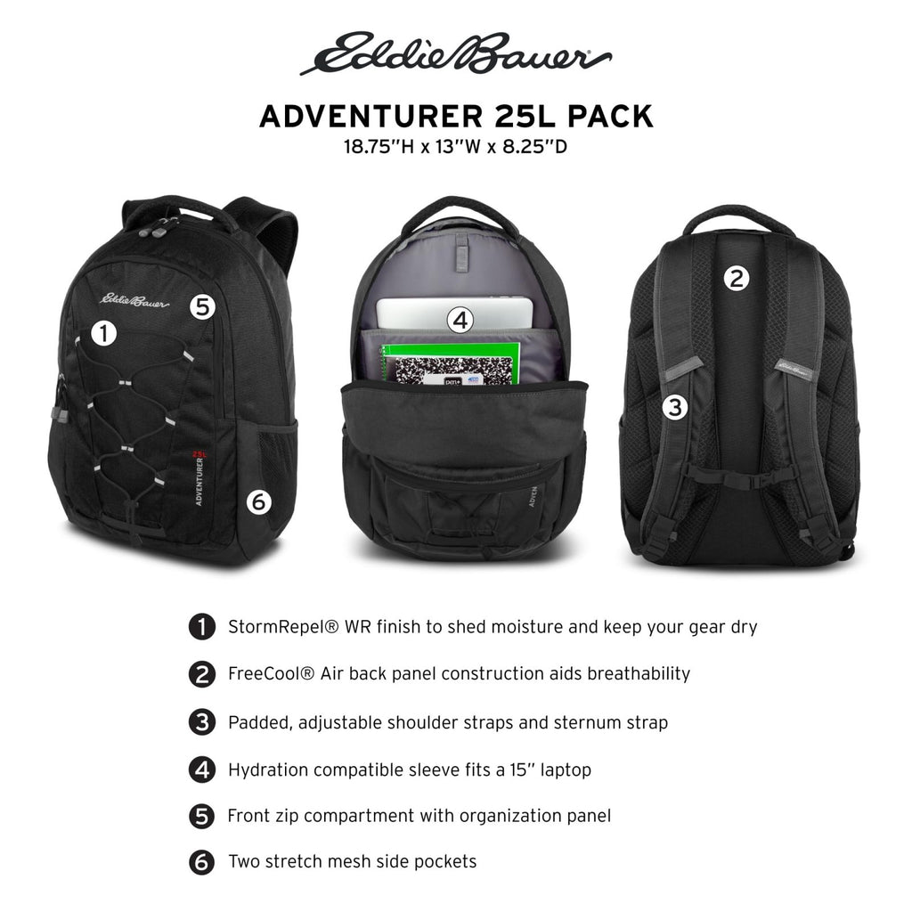 - DESIGNED FOR THE ULTIMATE OUTDOOR EXPERIENCE: The Eddie Bauer Adventurer 25L Backpack is weather-ready with a StormRepel WR finish to shed moisture and keep your gear dry. The FreeCool Air back panel technology boosts air flow to help keep you comfortable and dry, perfect for the outdoor enthusiast or taking a simple hike.