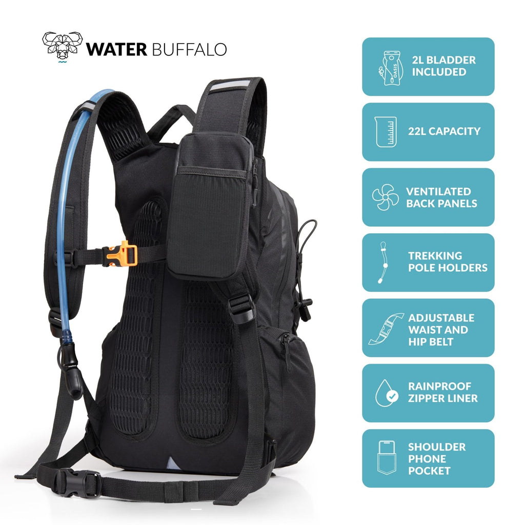 Brand: Water BuffaloColor: BlackFeatures: Spacious 22L Water Backpack for Hiking– This hiking hydration backpack features six storage pockets, providing ample space for snacks, extra layers, and trail essentials. Leakproof 2L Bladder for Hydration on the Trail – Stay refreshed with the BPA-free 2-liter bladder, designed with a wide opening for...