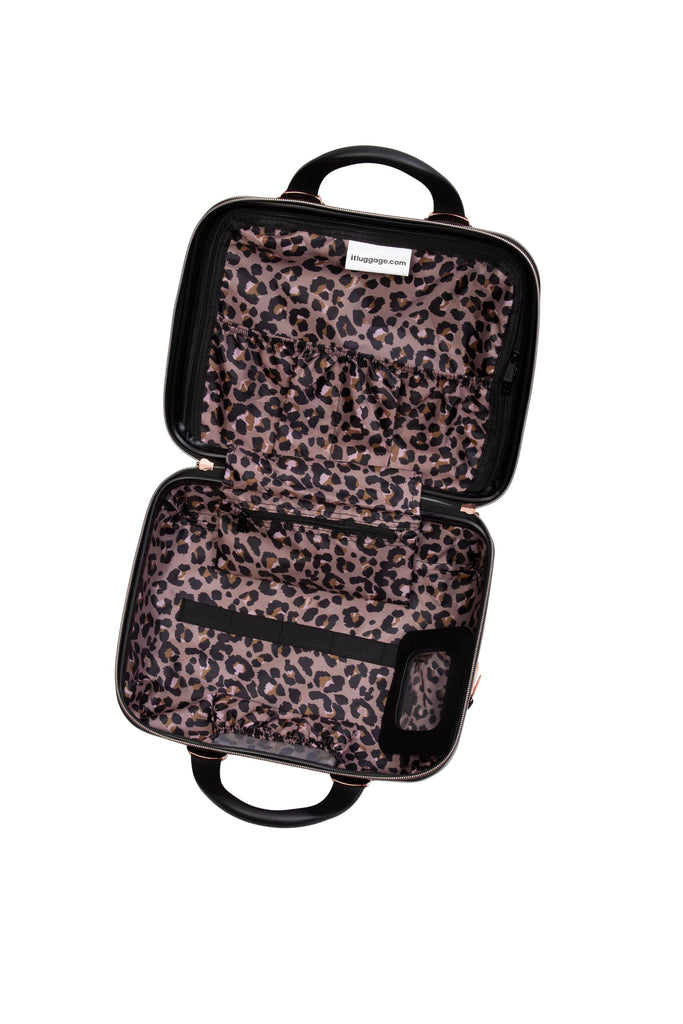 Pack your party glam and elevate your travel style—the Glitzy Vanity Case is here to shine. Combining a chic, ultra-stylish design with smart organization, this vanity turns heads with its quilted, high-shine outer shell while treating your essentials to a luxurious leopard-print interior. The clamshell opening reveals a spacious zippered compartment and elasticated organizers, perfect for makeup brushes, skincare, and all your beauty must-haves. Compact yet incredibly versatile, the Glitzy Vanity Case can hold everything from your everyday essentials to a full glam kit—or even serve as the perfect mini-weekender for short trips. Carry it your way using the dual grab handles or the adjustable shoulder strap, and for seamless travel, secure it onto any Glitzy suitcase with its convenient elasticated back straps. It’s the ultimate accessory for stylish travelers on the move.