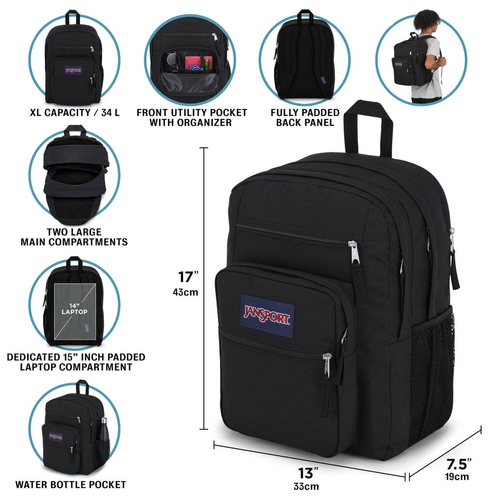 JanSport Texas Longhorns Big Student Backpack with Padded 15-Inch Laptop SleeveGo big with the Big Student Backpack-a spacious, durable, and comfort-forward pack. Featuring an officially licensed Texas Longhorns logo, this pack combines style with practical function. Built with two large main compartments, offering plenty of room to carry everything from textbooks and clothes to tech gear and travel essentials. The dedicated 15-inch padded laptop sleeve with zip closure offers reliable protection for your device, making it a smart choice for tech-savvy users navigating their daily routines. Whether you're headed to class, the office, or an outdoor adventure, this backpack has the space and organization you need.The Big Student features ergonomic S-curve shoulder straps and a fully padded back panel for lasting comfort, while the front utility pocket and two exterior zippered stash pockets keep all your gear organized. The single mesh side pocket fits a large water bottle. The webbing grab handle on top and innovative cord tabs on the zipper pulls keep things simple, allowing for easy grab-and-go access. Crafted for daily use and made to last, it's the go-everywhere backpack for students, commuters, professionals and anyone aged 13 and older.