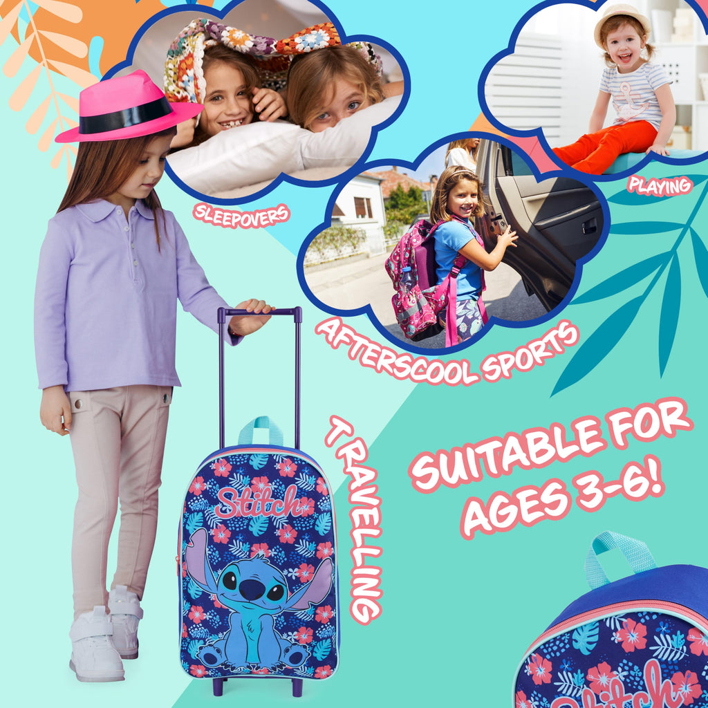 - Stitch Girls Suitcase - Let your child travel with Stitch's charm in this foldable trolley bag. Featuring a fun Stitch design and two wheels, it’s perfect for little adventurers