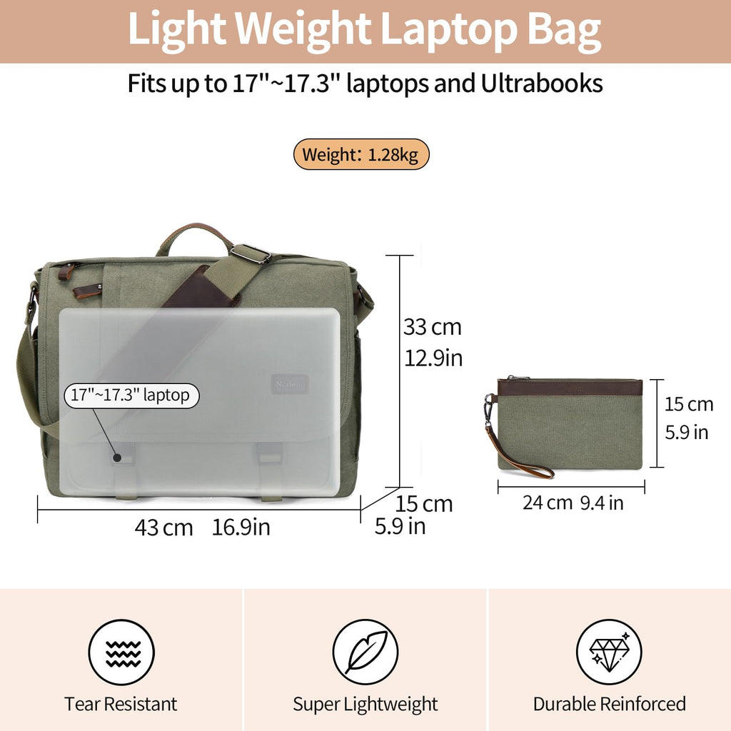 Nerlion Messenger Bag for Men 17-17.3 Inch Laptop Bag Canvas Water-resistant Computer Bag Shoulder Bag Work Briefcase Bookbag for College (Green)