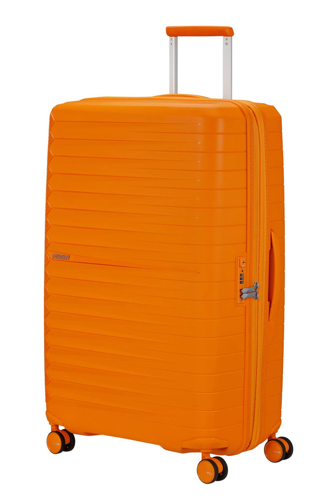 Brand: American TouristerColor: Radiant OrangeFeatures: Fastfoward Check in Spinner is perfect for has everthing you need to make your quick getway stress free and fun! 100% by weight of the interior fabric is made with post-consumer recycled PET plastic using 28 recycled bottles of 500ml Shock and noise reducing suspension...