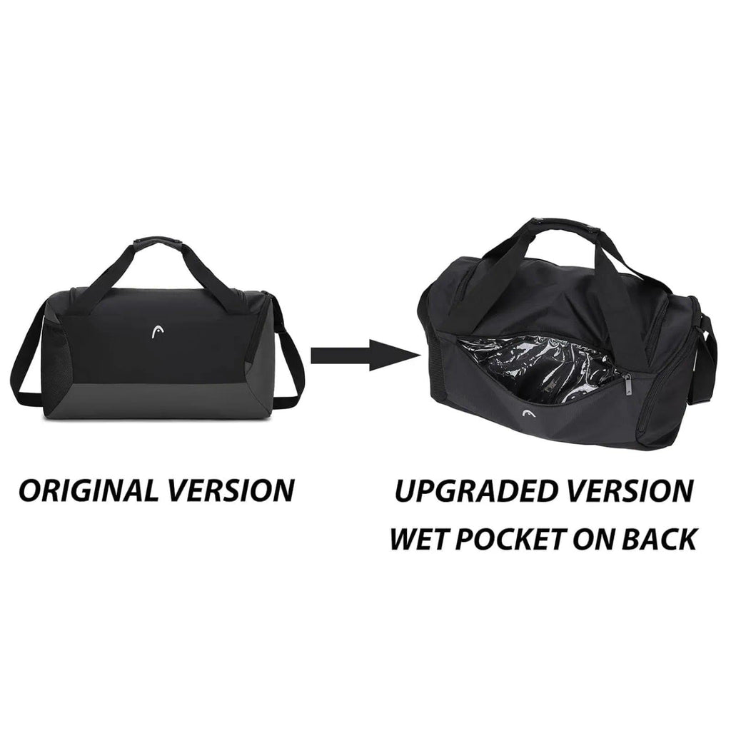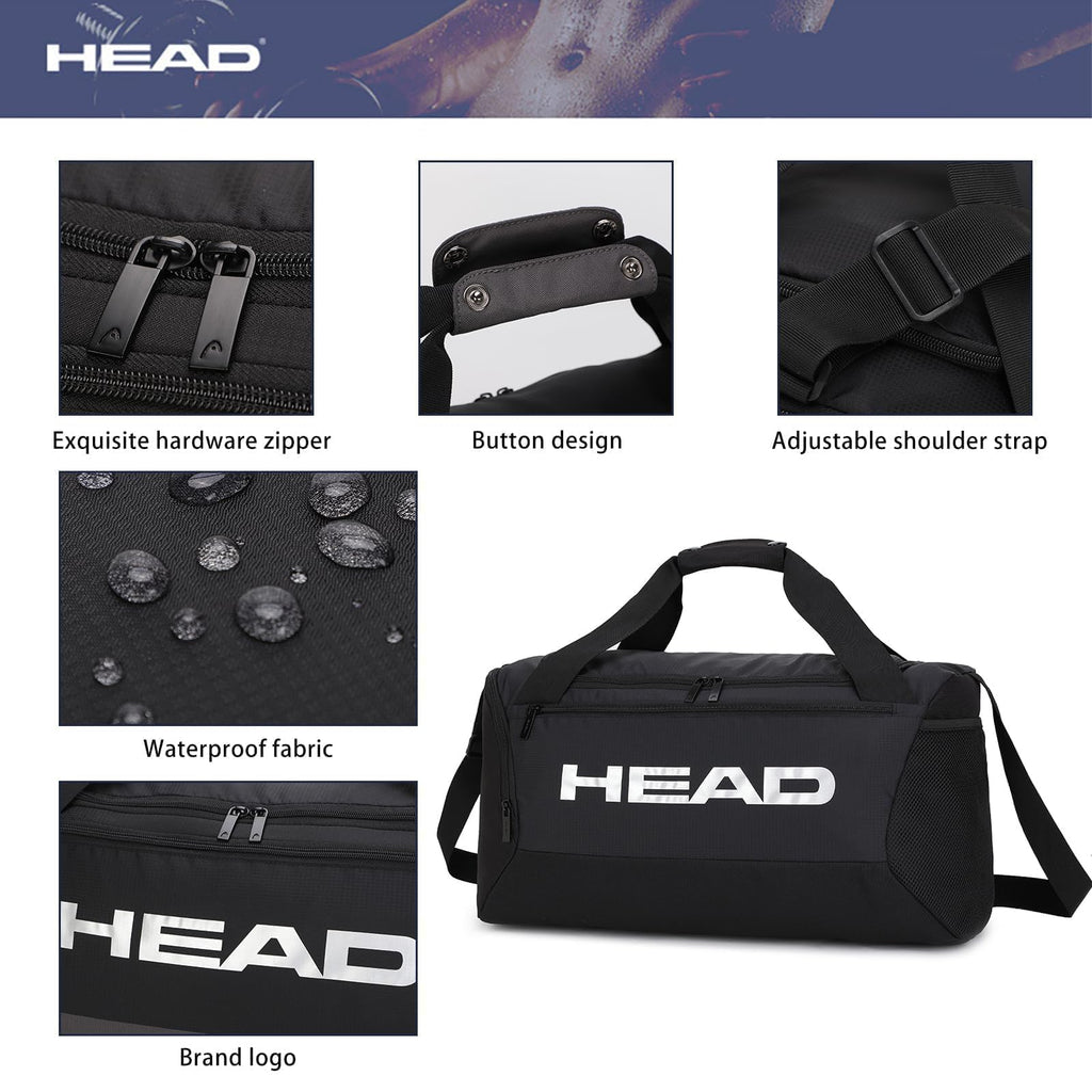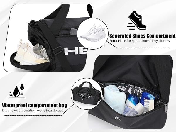 Brand: HEADColor: Black with Dry Wet PocketFeatures: 【45L Large Gym Duffel Bag】Designed as a premium men’s gym bag, this 45L duffle bag for men measures 19.6" × 11.8" × 11.4" with a wide U‑shaped opening for easy packing. It features an inner zip pocket, mesh side pocket, shoe compartment, back...