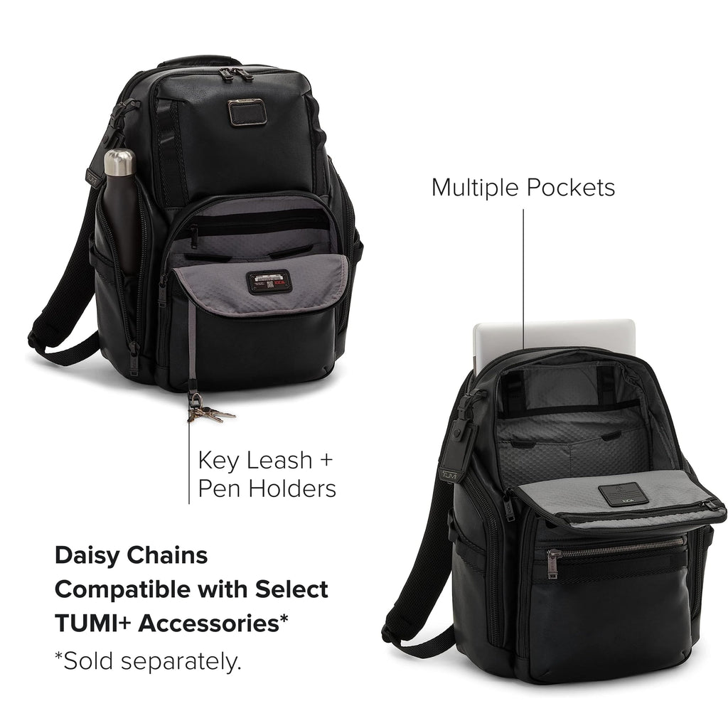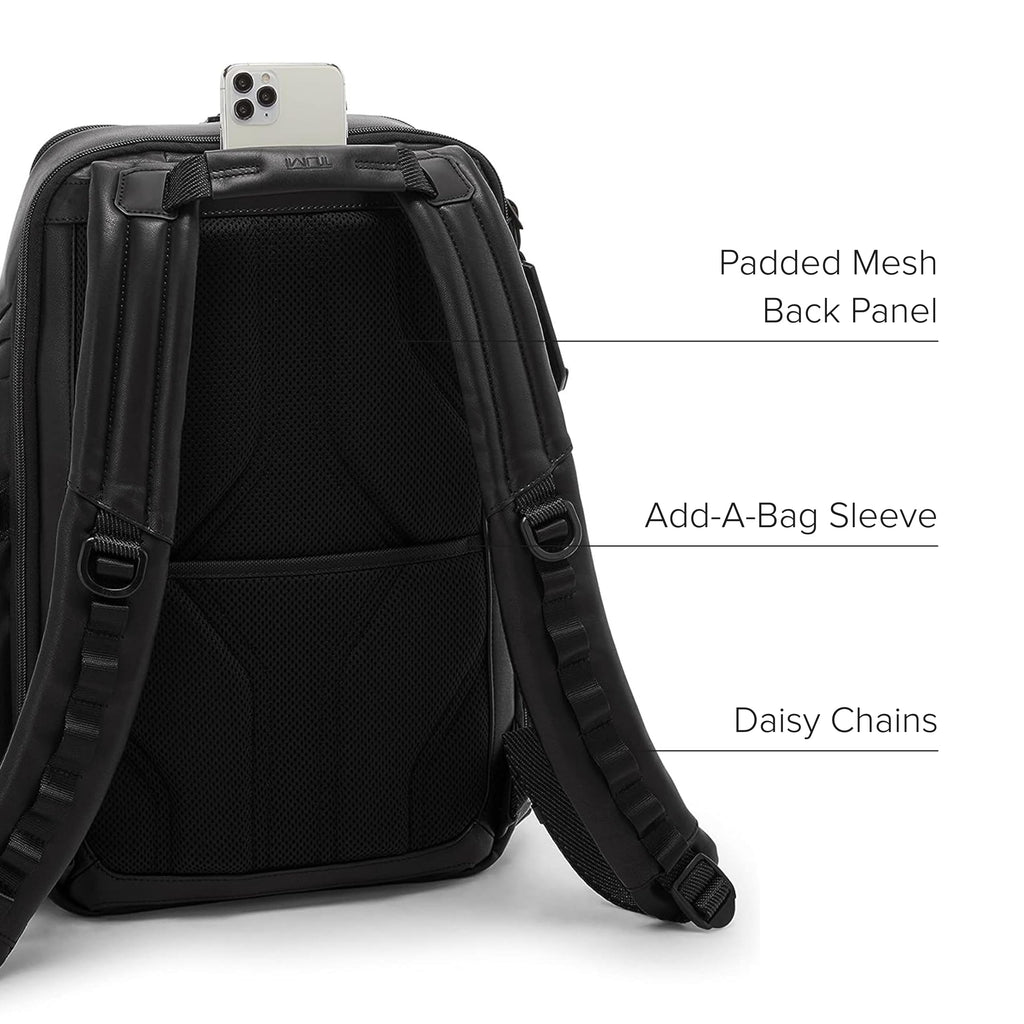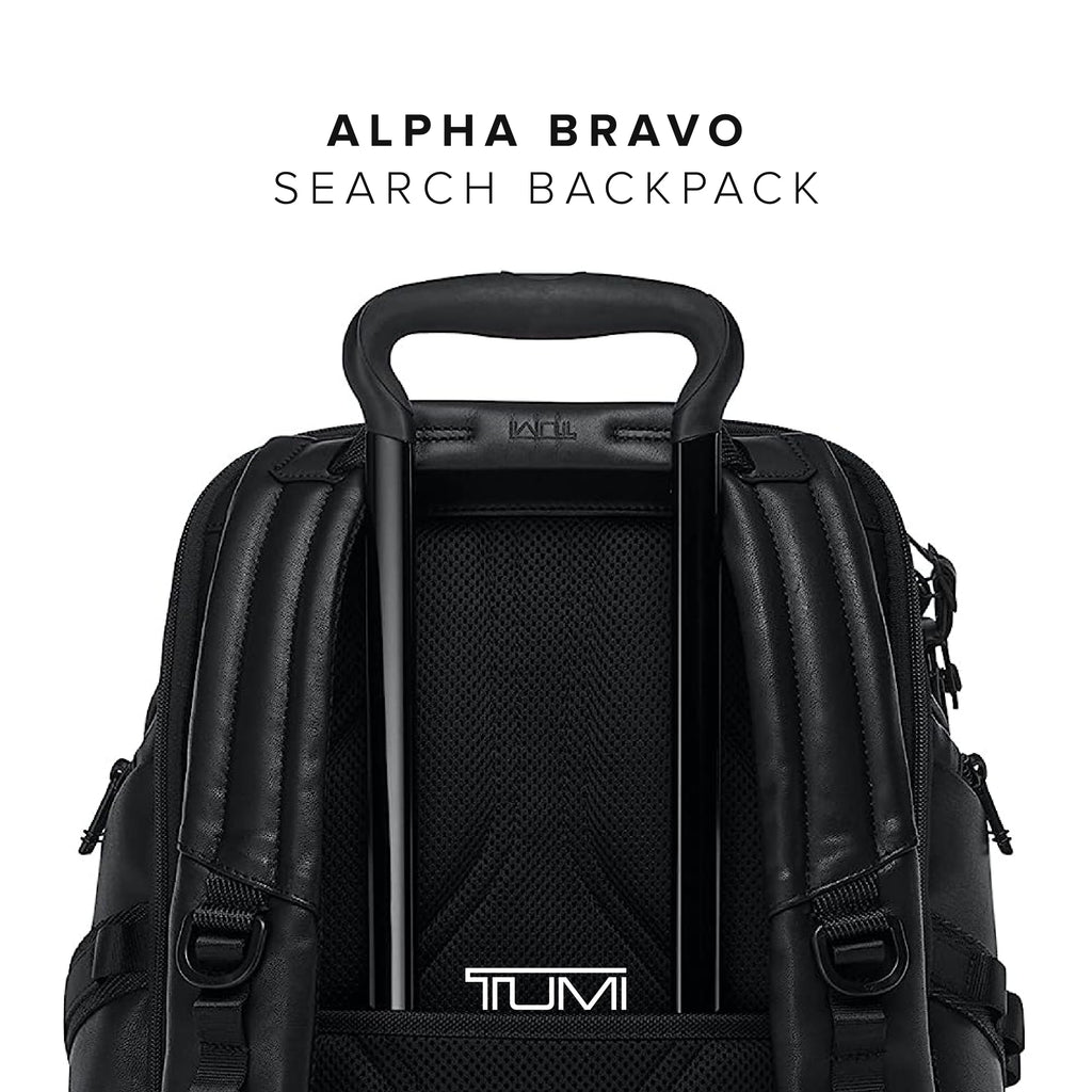 Brand: TUMIColor: Black LeatherFeatures: Modern, Versatile Travel Backpack: The TUMI Alpha Bravo Search Backpack is ideal for daily commutes to work and for travels that take you farther Durable Tech Backpack: Crafted from ballistic nylon, this heavy duty backpack has a zip entry to a padded laptop compartment, fitting up...