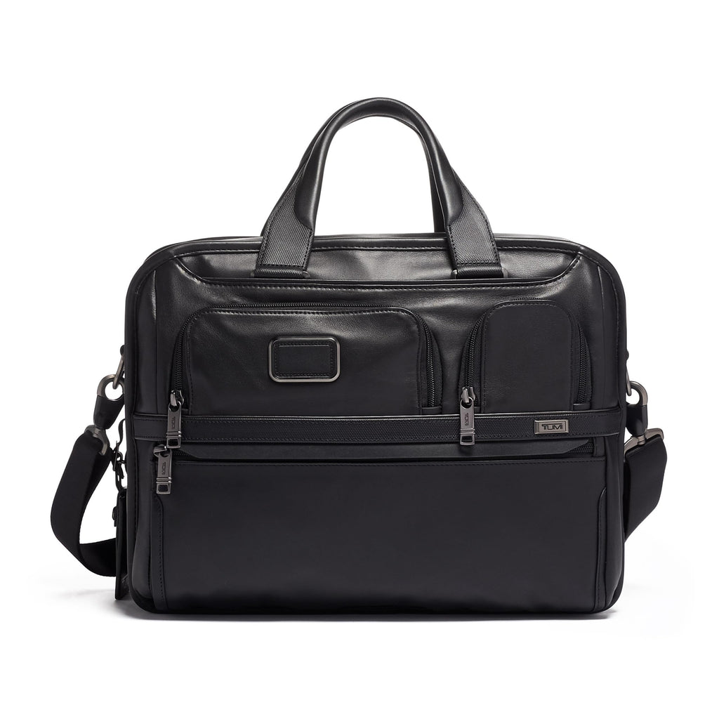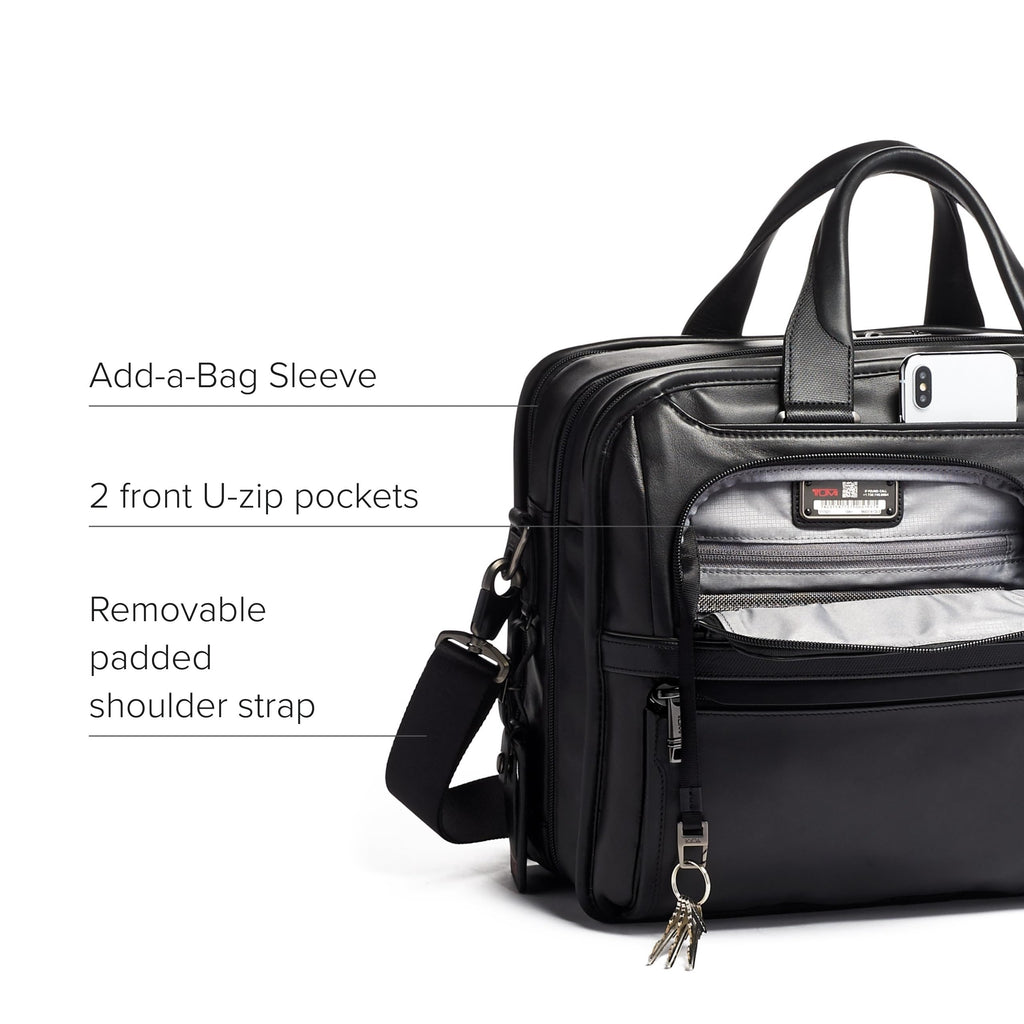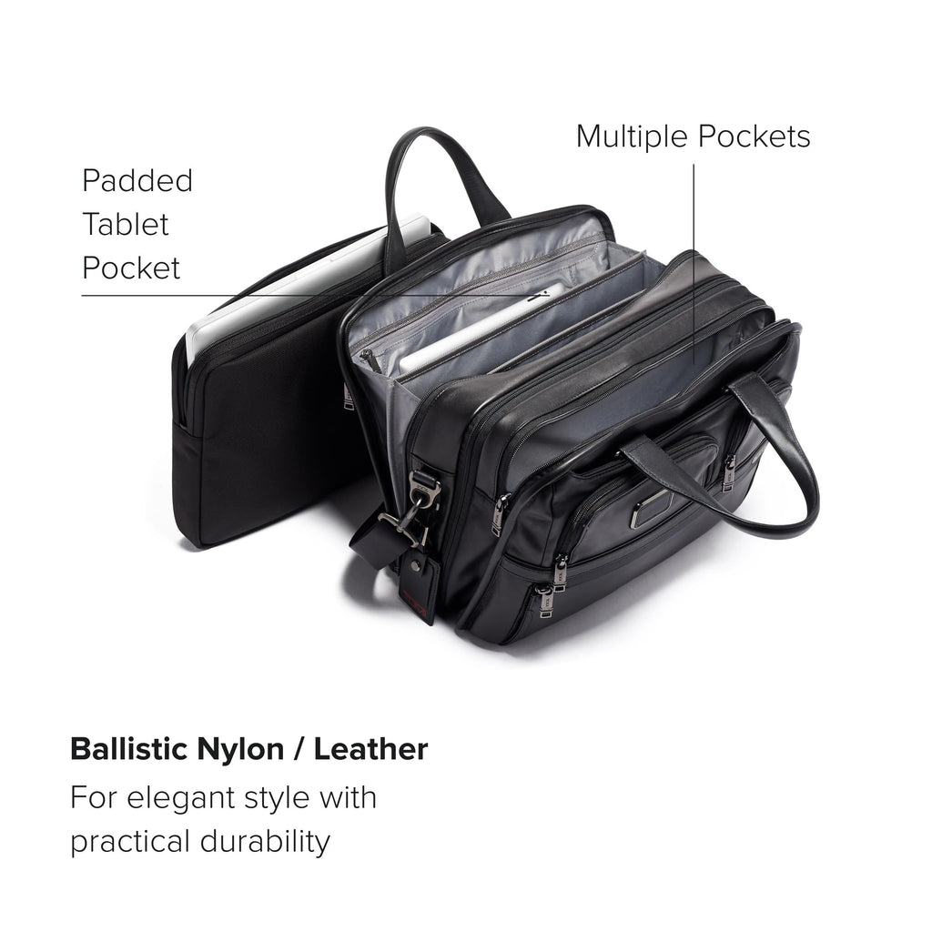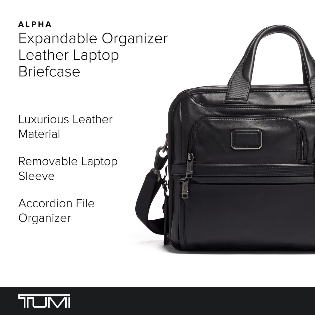 With a removable laptop sleeve for up to 15'' screen laptops, an expandable main compartment, and an accordion file organizer, the TUMI Alpha Expandable Organizer Laptop Briefcase provides exceptional versatility and organization. Features include a padded tablet pocket and multiple pockets for accessories. The exterior has two U-zip pockets including one with a water-resistant lining for an umbrella or water bottle. Part of our Alpha Collection, iconic business and travel pieces that bring together innovative design, superior performance, and best in class functionality. Select styles come outfitted with a colorful TUMI Accents Kit (luggage tag, monogram patch, handle wrap and zipper pull ties) for an additional cost. Made from TUMI's signature, ultra-durable FXT ballistic nylon.