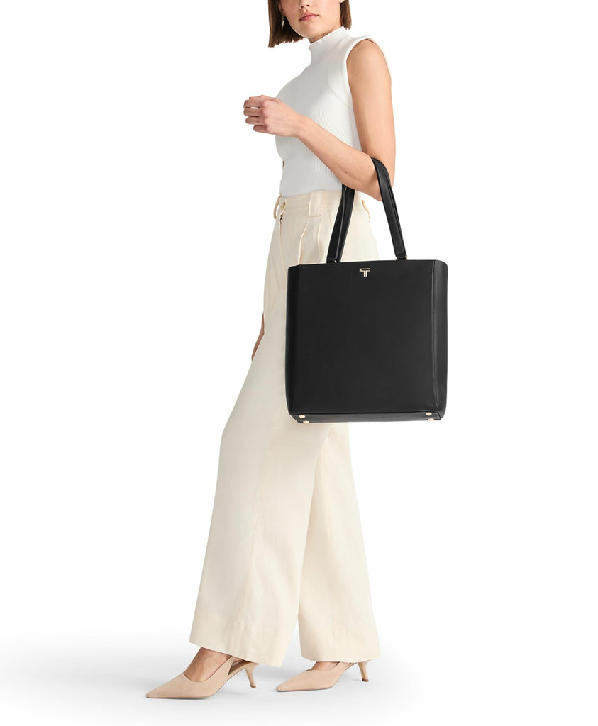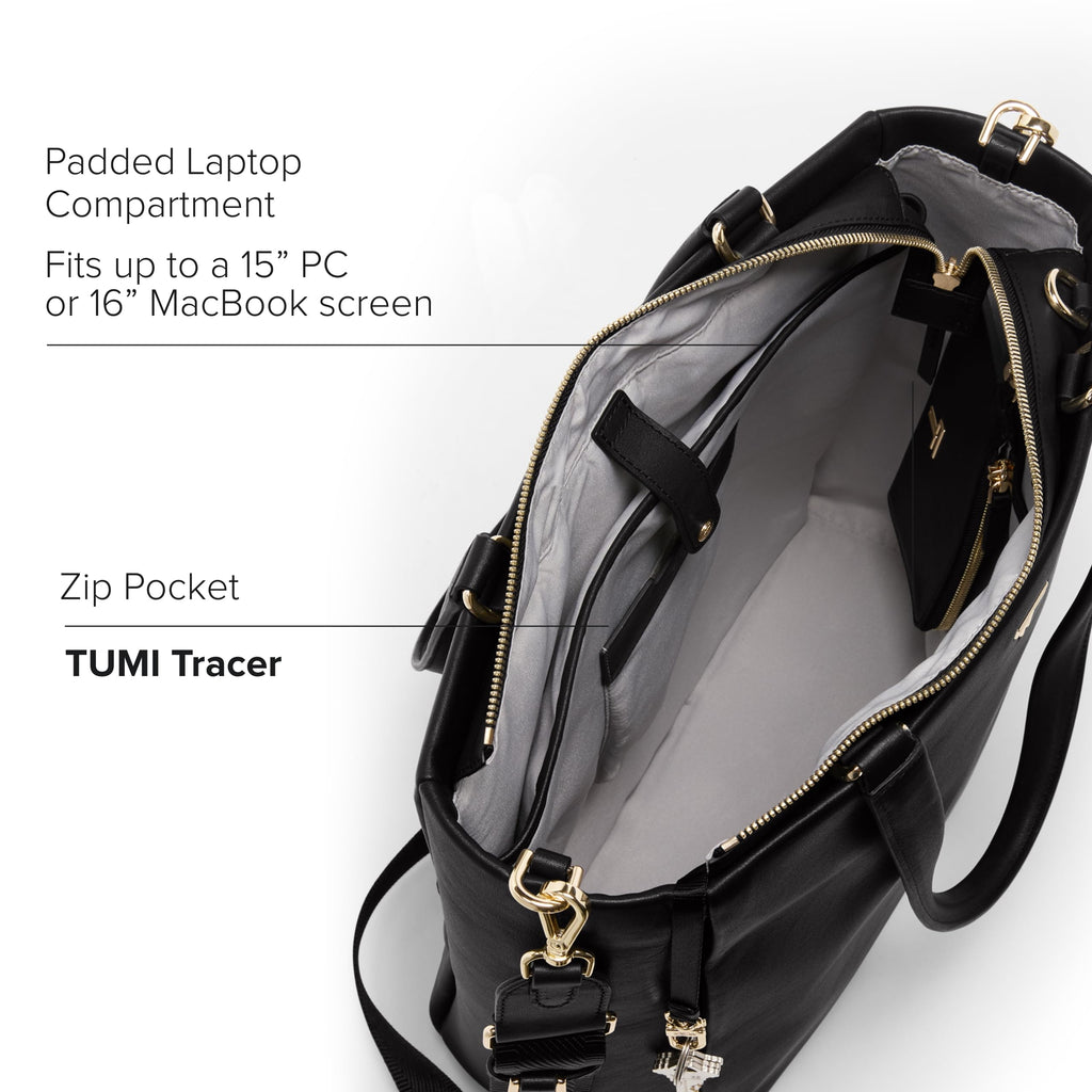 Travel comfortably and in style with the women's Voyageur Vail Leather Tote. Designed as the perfect tote bag for women, this elegant leather bag seamlessly blends sophistication with practicality. Whether heading to the office or exploring the city, the black tote offers ample space to carry all your essentials. The zip entry ensures easy access to the main compartment, while multiple zip pockets keep your belongings organized and secure. A dedicated phone pocket provides quick access to your device, making it perfect for the modern commuter. The padded laptop compartment with leather snap tab (fits up to a 15” PC or 16” MacBook screen) transforms this tote into a reliable laptop bag for your daily needs. Additionally, the water bottle pocket ensures you stay hydrated on the go. The back open pocket converts into an Add-a-Bag sleeve, so you can attach it to your luggage. Durable metal feet protect the bottom of the tote, while the microfiber-lined interior and pen pocket offer additional organization. Elevate your daily commute and travel adventures with this exquisite travel tote, designed to meet all your lifestyle needs. We design for you. Our commitment to exceptional quality and high performing products have made TUMI the leading lifestyle and accessories brand that travelers depend on consistently. This is what we call the TUMI Difference. By putting excellence and quality first, we are committed to creating quality TUMI products that have lifelong purpose, are supported by our rigorous testing standards, use recycled materials and our global repair network.