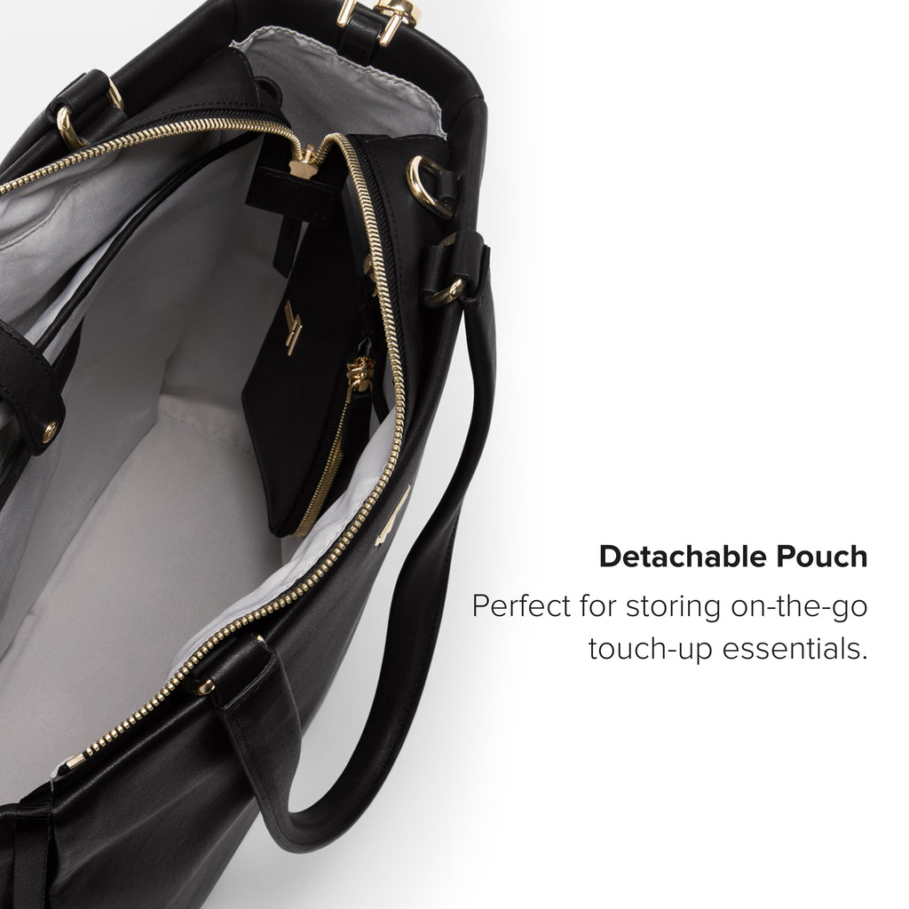 - Zip Entry Main Compartment: This black tote features a water bottle pocket and multiple zip pockets for organization