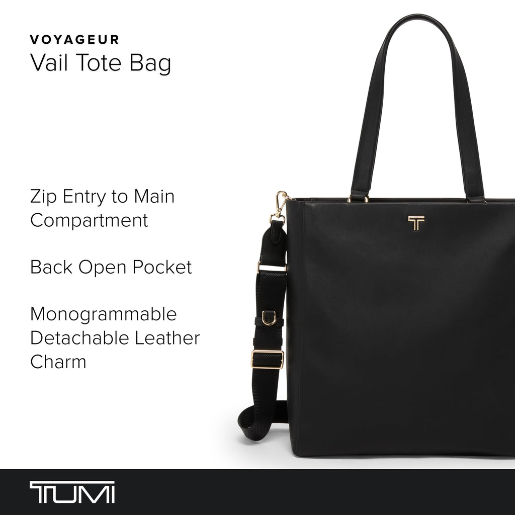 Travel comfortably and in style with the women's Voyageur Vail Leather Tote. Designed as the perfect tote bag for women, this elegant leather bag seamlessly blends sophistication with practicality. Whether heading to the office or exploring the city, the black tote offers ample space to carry all your essentials. The zip entry ensures easy access to the main compartment, while multiple zip pockets keep your belongings organized and secure. A dedicated phone pocket provides quick access to your device, making it perfect for the modern commuter. The padded laptop compartment with leather snap tab (fits up to a 15” PC or 16” MacBook screen) transforms this tote into a reliable laptop bag for your daily needs. Additionally, the water bottle pocket ensures you stay hydrated on the go. The back open pocket converts into an Add-a-Bag sleeve, so you can attach it to your luggage. Durable metal feet protect the bottom of the tote, while the microfiber-lined interior and pen pocket offer additional organization. Elevate your daily commute and travel adventures with this exquisite travel tote, designed to meet all your lifestyle needs. We design for you. Our commitment to exceptional quality and high performing products have made TUMI the leading lifestyle and accessories brand that travelers depend on consistently. This is what we call the TUMI Difference. By putting excellence and quality first, we are committed to creating quality TUMI products that have lifelong purpose, are supported by our rigorous testing standards, use recycled materials and our global repair network.