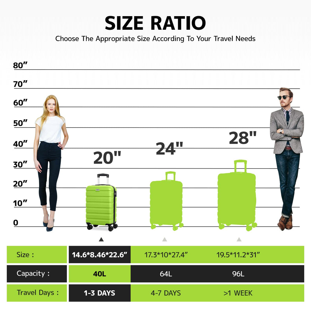 Brand: AnyZipColor: Apple GreenFeatures: [Carry-On 20 Inch] The 20-inch suitcase can meet the functions of boarding, travel, and daily storage, and can be brought on the plane without checking in. Size: 14.6*8.46*22.6 inches. Capacity: 40L. [Larger storage space] We have adopted a more scientific structure design to maximize the use...