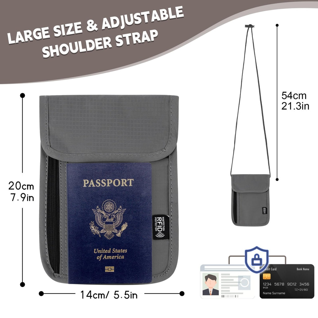Brand: LikesingColor: GreyFeatures: 【Adjustable Strap】Our travel neck pouch is 5.5" L x 7.9" W with adjustable length of up to 21.3" strap. Easily modify its length to transform it into a shoulder bag, passport crossbody bag, or a passport holder neck pouch, catering to your varied needs 【RFID Blocking Travel...