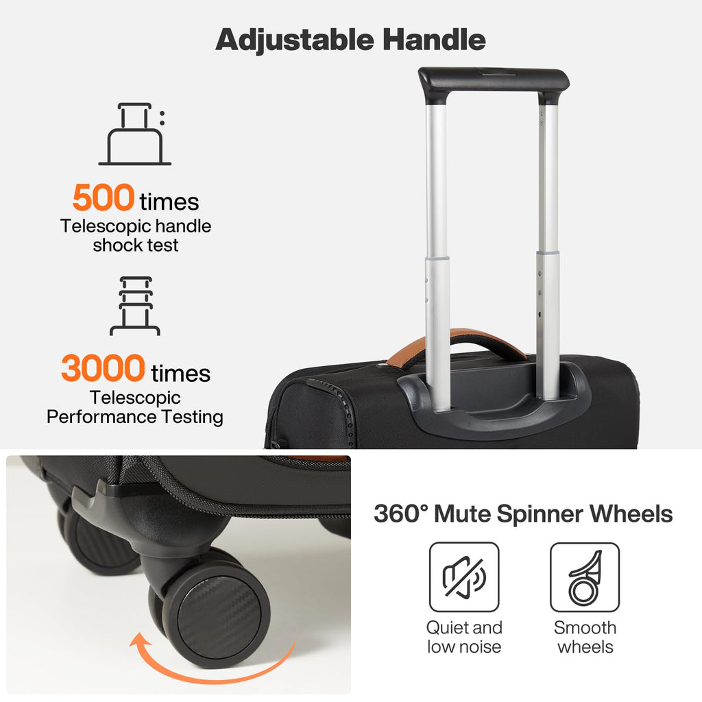 - 【Convenience】High-precision dual-row spinner wheels with excellent wear resistance and mute effect allowing the softside luggage to move smoothly in the airport terminal. The adjustable telescopic handle provides multiple height settings, and the stable retractable rod reduces wobbling when walking on any road surface