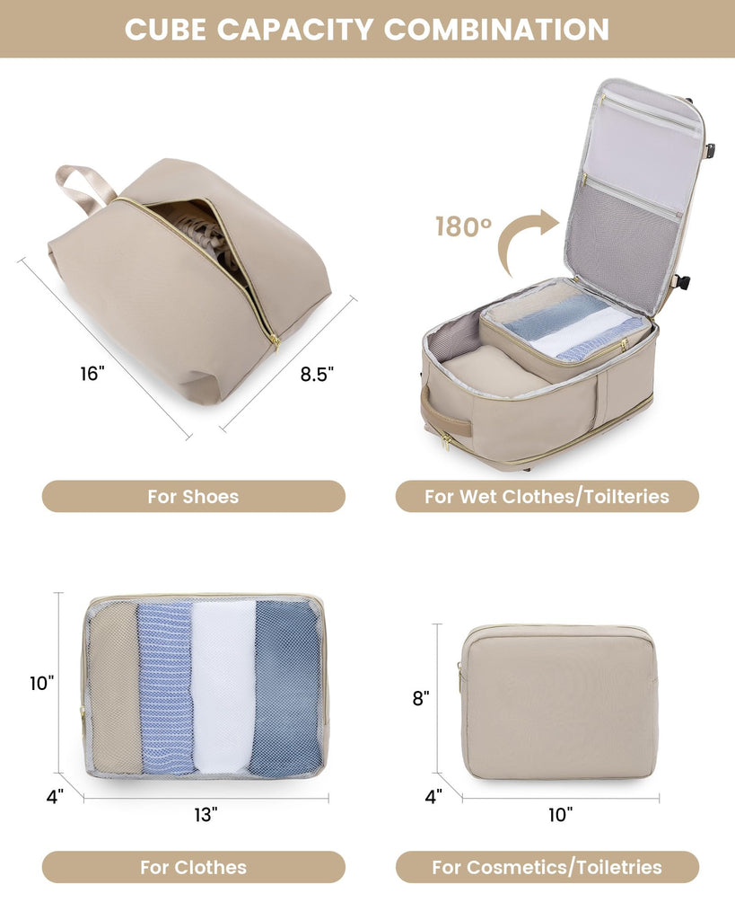 Brand: LOVEVOOKColor: Khaki - Beige - AbricotFeatures: 【Large Capacity & Well Organized】40L capacity, 4 main compartments, and 15 pockets, designed to allow you to easily separate and organize your travel personal items, roomy space can even fit in 3-7 days of travel essentials. 【3 Packing Cubes and Wet Pockets】Equipped with...