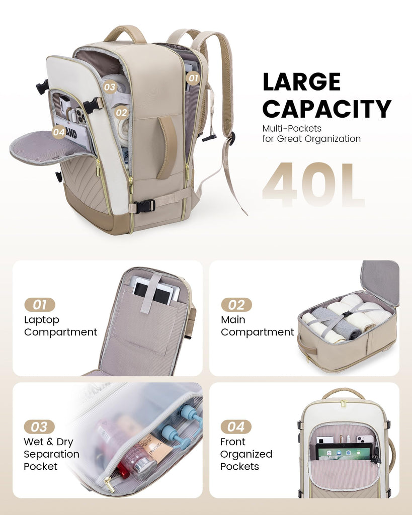 - 【Large Capacity & Well Organized】40L capacity, 4 main compartments, and 15 pockets, designed to allow you to easily separate and organize your travel personal items, roomy space can even fit in 3-7 days of travel essentials.
