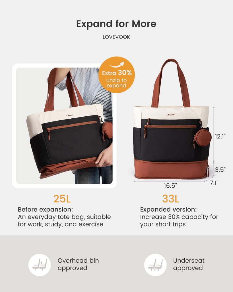 - [INSTANT 30% CAPACITY EXPANSION] Effortlessly transform this 25L daily tote into a 33L travel weekender with a bottom unzip. Perfect as a TSA approved personal item, it provides extra space for clothes or souvenirs, eliminating the need for extra luggage.