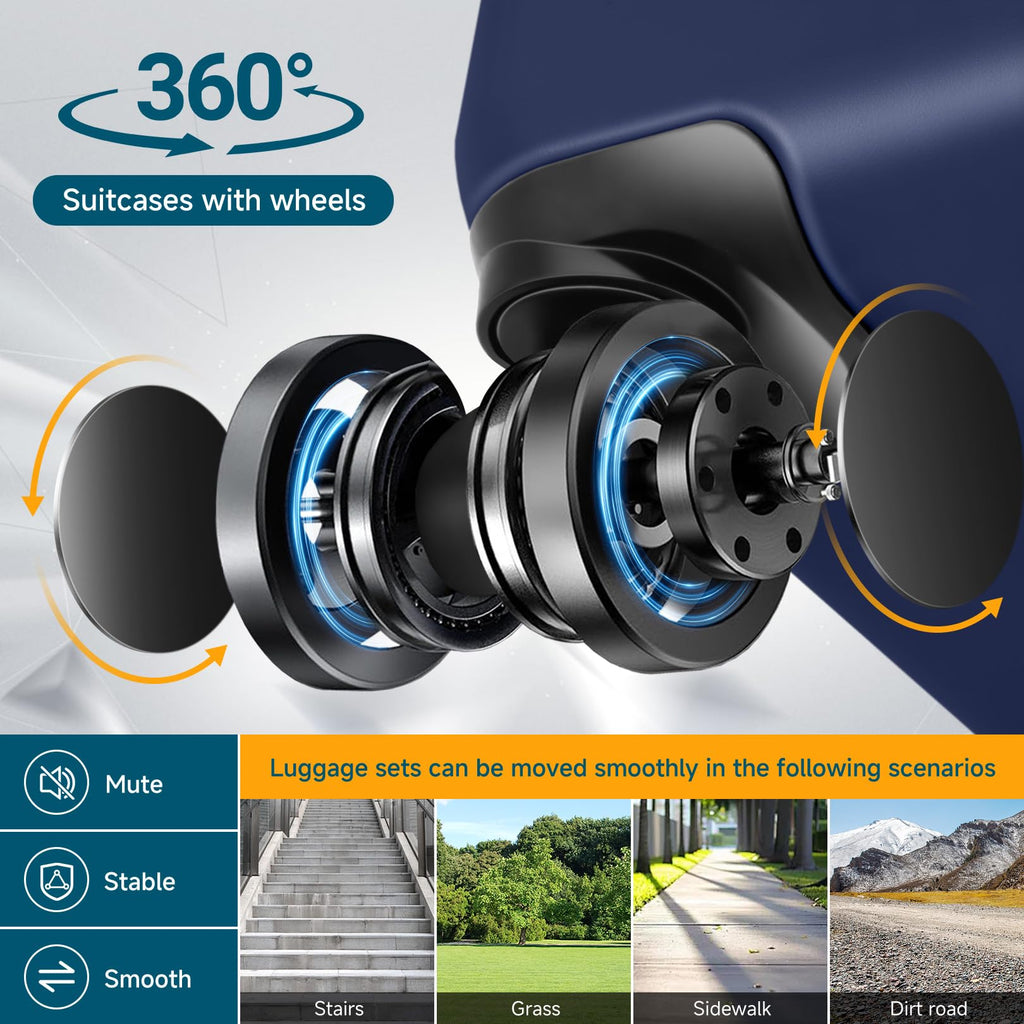 - 【360° Silent Dual-Spinner Wheels】Equipped with 8 smooth-rolling silent wheels, our luggage glides effortlessly in all directions. Tested on various surfaces including cobblestone, carpets, and slopes, these durable wheels ensure quiet and stable maneuverability through crowded airports and streets