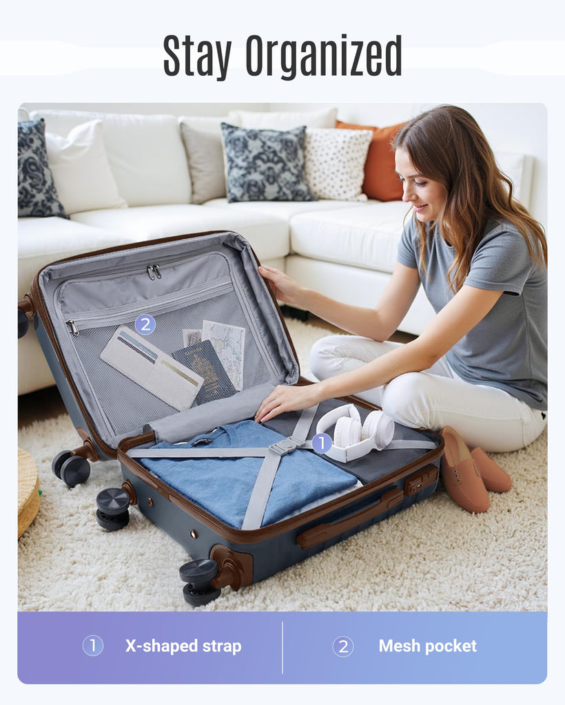 - Organized Interior: The interior of this luggage set is designed for optimal organization. It includes a U-shaped zipper pocket, a large mesh pocket, and a small zippered pouch, making it easy to store and access travel essentials. Compression straps help prevent clothing from shifting, maximizing space utilization. Whether packing for a weekend getaway or an extended trip, this lightweight luggage—available in 20-inch, 24-inch and 28-inch sizes—ensures efficient organization, perfect for check-in luggage
