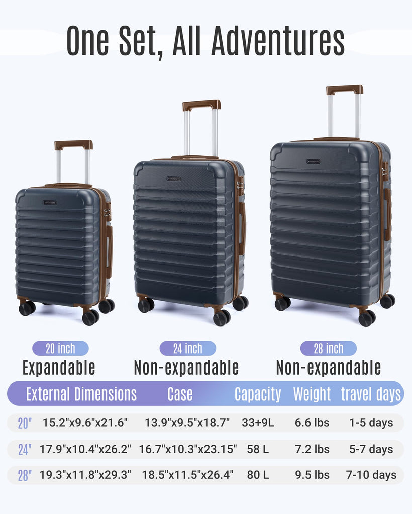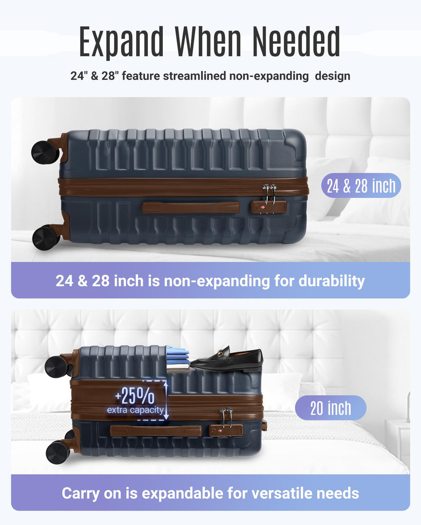 - Durable Construction: Crafted from high-quality ABS material, hard shell luggage sets offer exceptional durability while remaining lightweight. The textured surface not only enhances aesthetic appeal but also provides scratch resistance, ensuring luggage looks pristine after every journey. The 20 inch carry on luggage is airline approved and features a 25% expandable capacity, and the 24-inch and 28-inch suitcases are standard versions and do not offer an expandable feature. Capacity : 20" (42L, expandable), 24" (58L, non-expandable), 28"(80L, non-expandable)