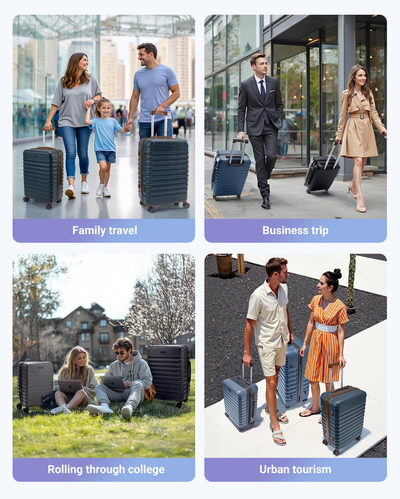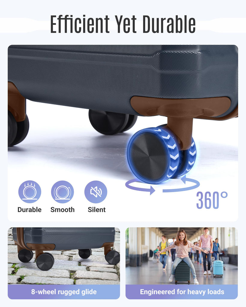 - Smooth Mobility: Experience effortless travel with premium 360-degree spinner wheels. Made with soft TPU and lubricated ball bearings, suitcases with wheels glide smoothly and silently, allowing for easy maneuverability in any direction. Designed for stability, the dual-wheel system ensures a steady roll, making 3 piece luggage set ideal for long trips or business travel. Enjoy a seamless journey, whether navigating crowded airports or bustling city streets