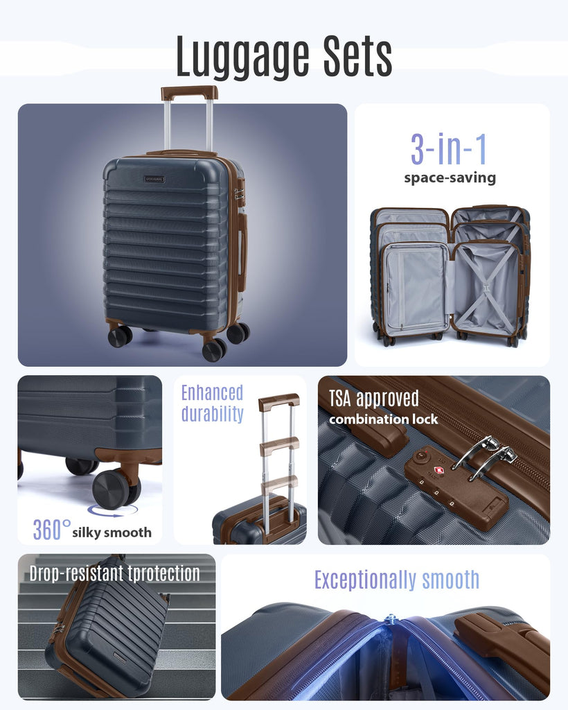 Brand: LIGHT FLIGHTColor: Blue/BrownFeatures: Durable Construction: Crafted from high-quality ABS material, hard shell luggage sets offer exceptional durability while remaining lightweight. The textured surface not only enhances aesthetic appeal but also provides scratch resistance, ensuring luggage looks pristine after every journey. The 20 inch carry on luggage is airline approved...