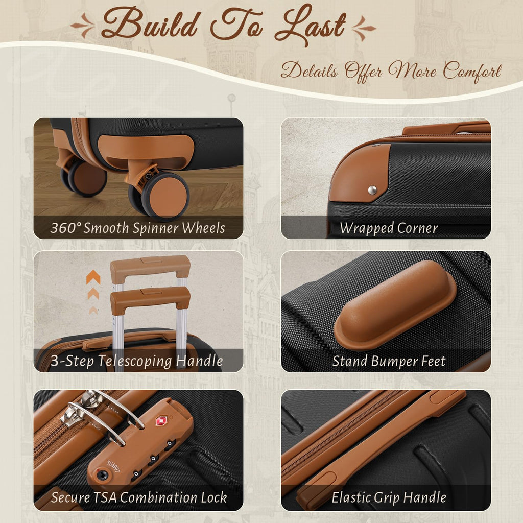 TAKUMI Carry On Luggage Set 3 Piece ABS+PC Hardshell Suitcases with Duffel Bag Double Spinner Wheels Travel Luggage with TSA Lock Lightweight Suitcase Set(BLACK BROWN, 3 PIECE SET(20/DB/TB))