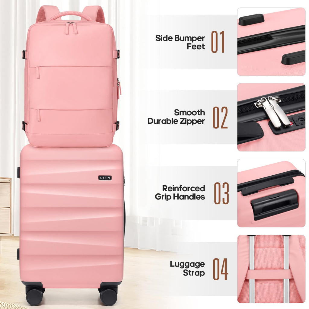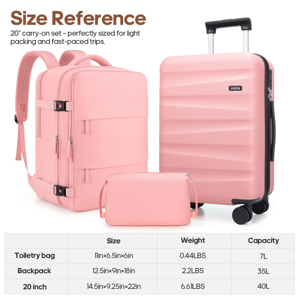 - Luggage with Backpack Set : The UKEIN 20-inch carry-on luggage is designed to fit comfortably in overhead bins on almost any flight. Paired with a matching backpack for carrying your in-flight essentials, while the large toiletry bag helps you stay organized with all your travel necessities. Ideal for both business and leisure trips, this suitcase set offers a practical and stylish solution for any traveler.