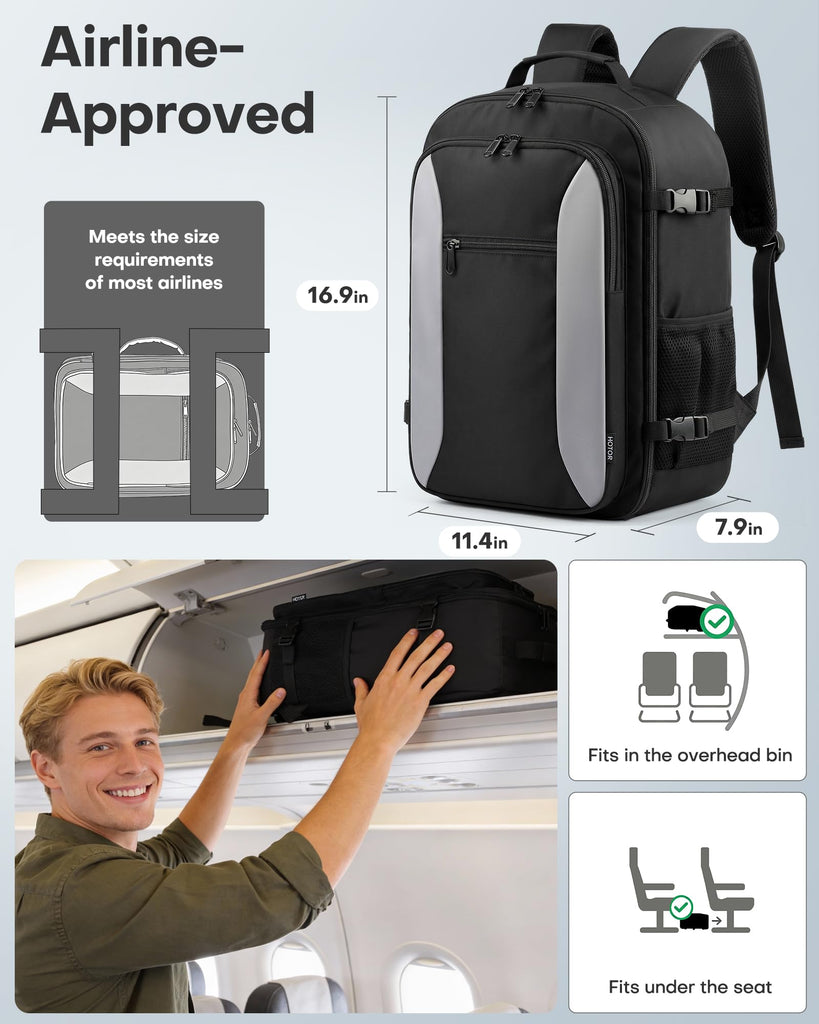 - AIRLINE CARRY-ON APPROVED: Carefully sized to meet most airline carry-on requirements, this travel backpack carry-on flight approved measures 16.9" x 11.4" x 7.9", making it easy to fit in overhead bins or slide under most airplane seats. Its compact yet spacious design keeps your belongings secure for hassle-free travel.