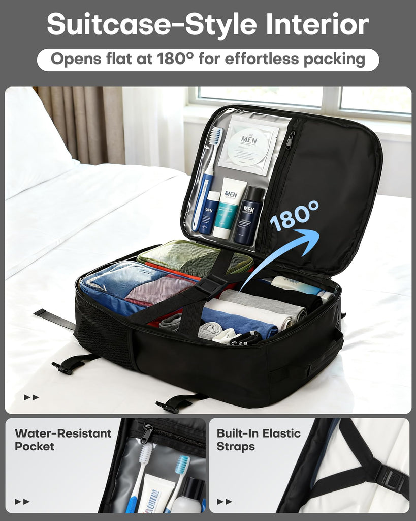 - SPACIOUS & WELL-ORGANIZED: This laptop backpack for men offers spacious compartments and smart organization for your essentials. A dedicated waterproof pocket keeps wet items separate, while internal luggage straps hold clothes and personal items securely. Everything stays neatly arranged and easily accessible on the go.