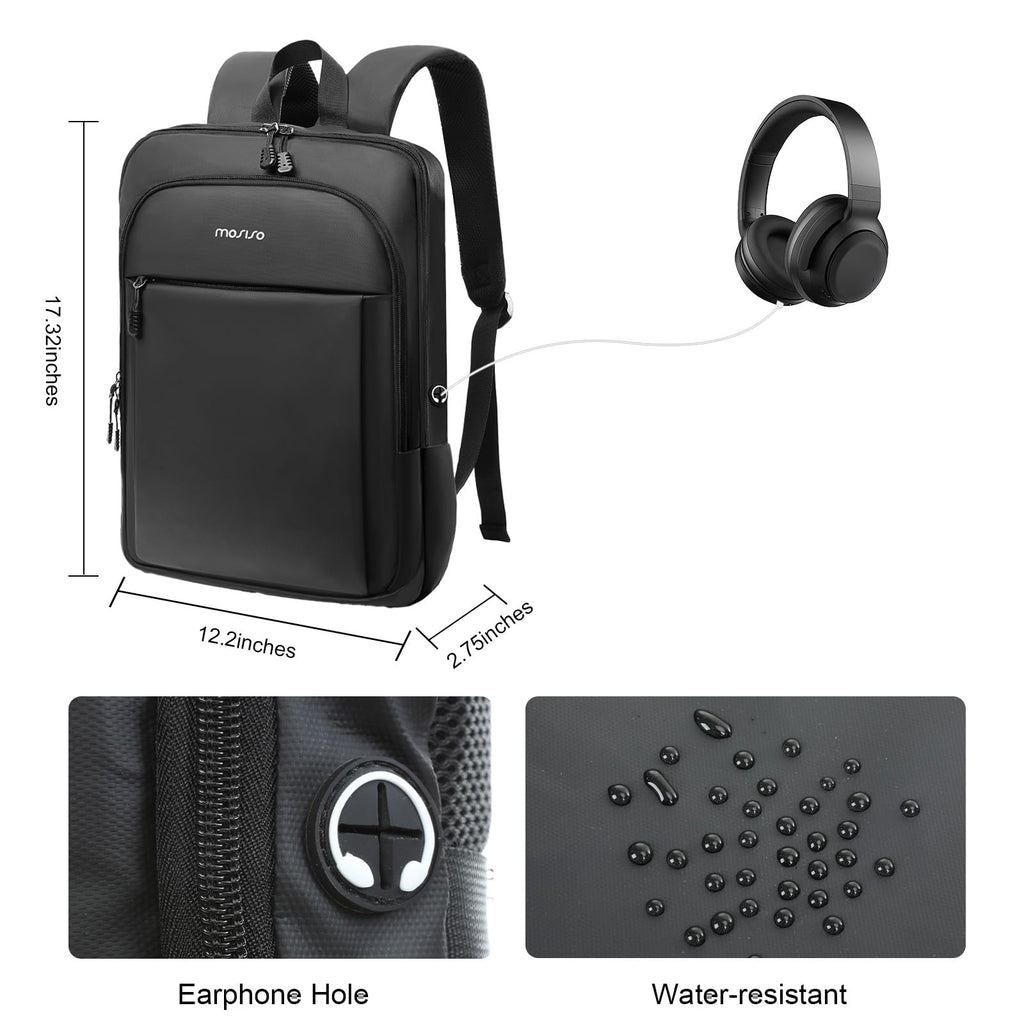 Brand: MOSISOColor: BlackFeatures: Dimensions of this laptop backpack is 17.32 x 12.2 x 2.75 inches (L x W x H). Weight :1.28 lb. Simple in design and easy to use, this thin backpack can hold up to a 15.6 laptop. This compact backpack has 1 main compartment and 3 front...