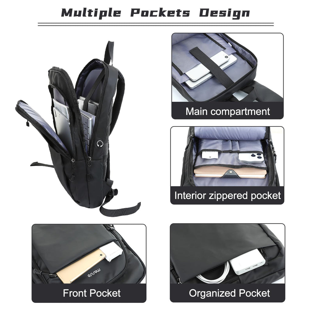 - The work backpack is made of waterproof polyester with gliding smoothly zippers, allows you convenient access to your stuff. Lightweight and soft, and easy to clean. Meanwhile the breathable shaped padded shoulder strap and back panel is extremely comfortable and lightweight, which will release heat rather than accumulate. An earphone hole enables you to enjoy music easily.