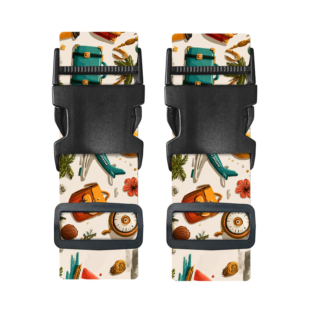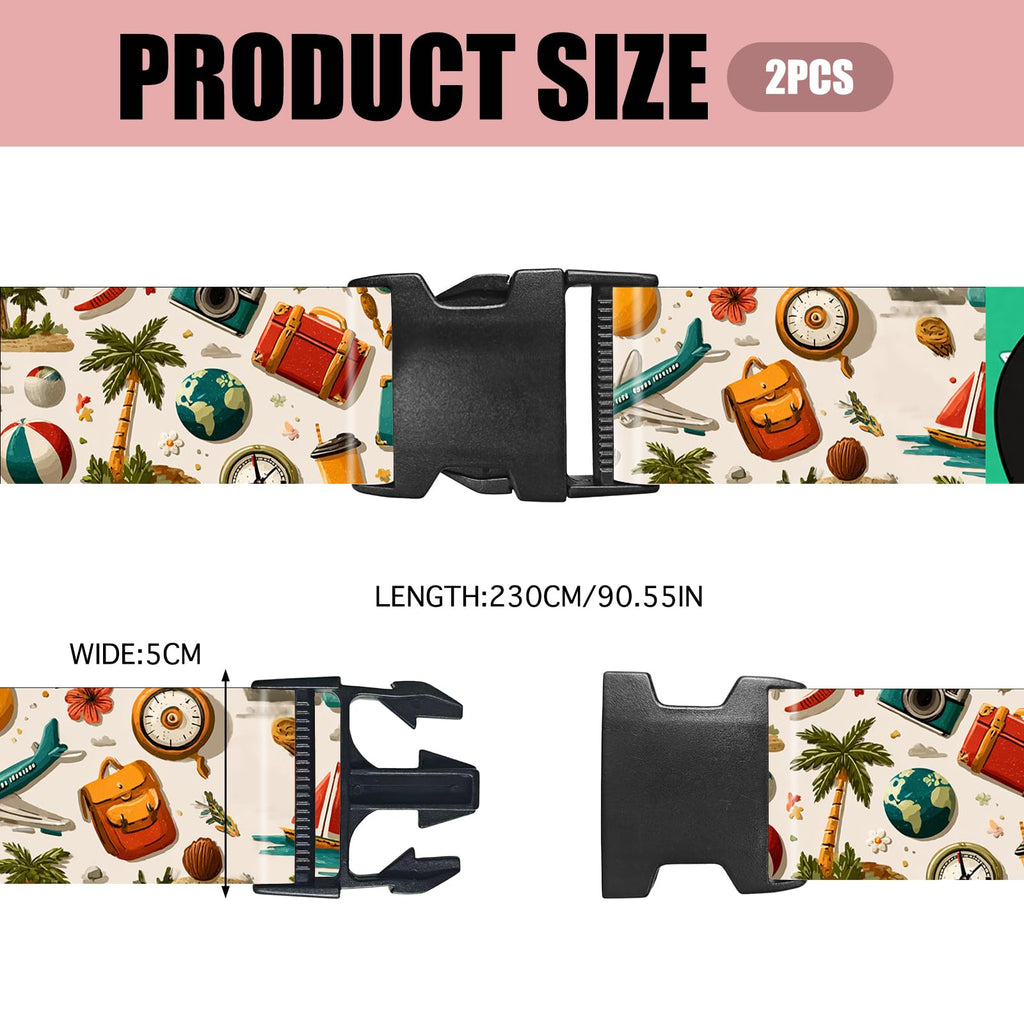 - You will obtain Luggage Straps of 2 Set various travel elements, such as suitcases, a plane, palm trees, a globe, and sunglasses, capturing the essence of travel.