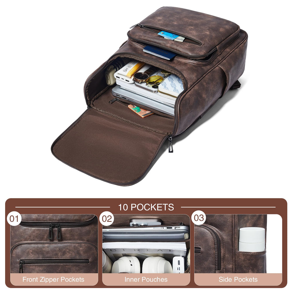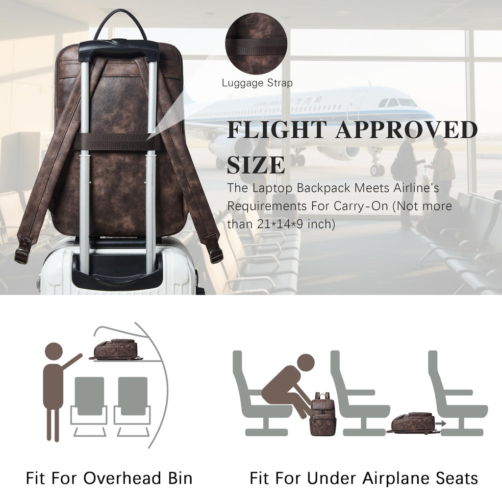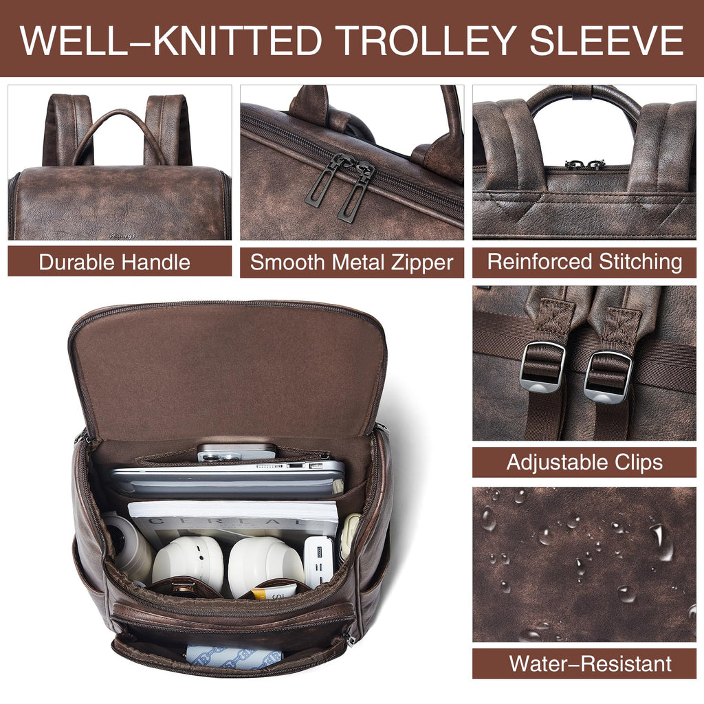 tiamyi leather travel backpack for men and women, flap top laptop backpack fits 17.3 inch computer with luggage strap and separate padded compartment, coffee
