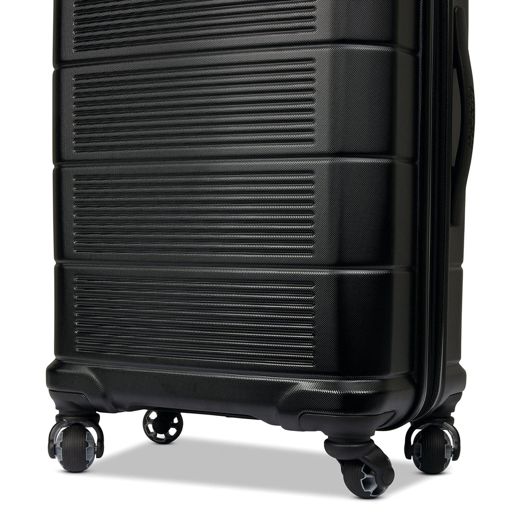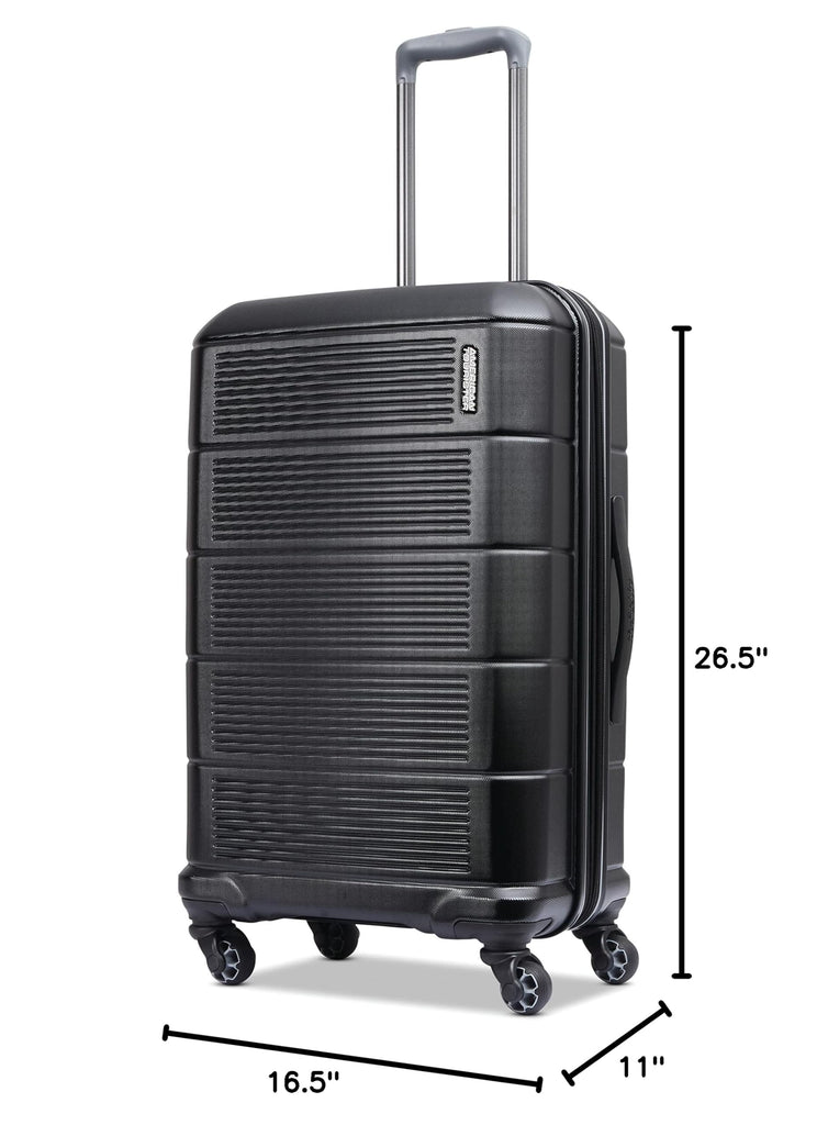 Brand: American TouristerColor: Jet BlackFeatures: STRATUM 2.0 Carry On Spinner is perfect for a 1-3 day trip, this little guy has everthing you need to make your quick getway stress free and fun! Sturdy handling with our ergonomic carbon fiber texture trolly grip that adjusts to you size. Roll confidently...