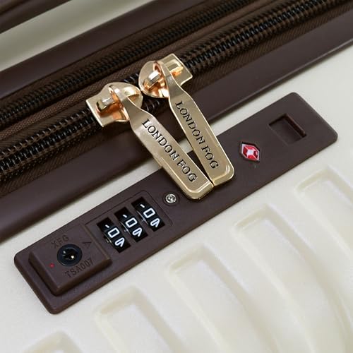 Brand: LONDON FOGColor: Off WhiteFeatures: Durable polycarbonate construction Color coordinating corner guards 8-recessed spinner wheels with Control Track Self Aligning Technology Flush mounted TSA approved combination locks Built-in USB charging port on 20" Locking trolley handle has aluminum channel tubes London Fog signature lining Interior has a wet pocket, zippered...