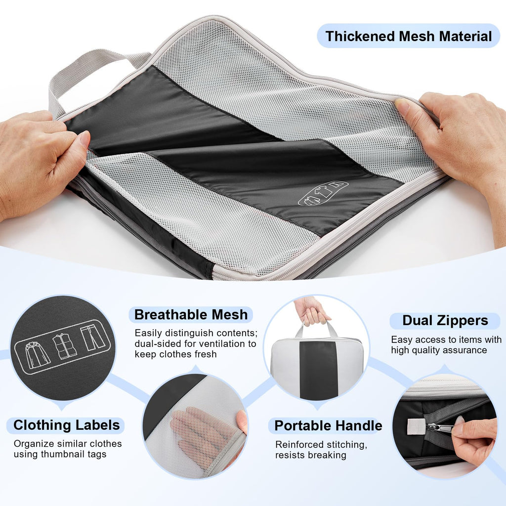 - Maximize Packing Efficiency - Make every inch of your luggage count! These compression cubes work like a mini vacuum sealer, using an extra outer zipper to reduce bulk and create more space. Pack more clothes without sacrificing options—your favorite outfits, now travel-ready.