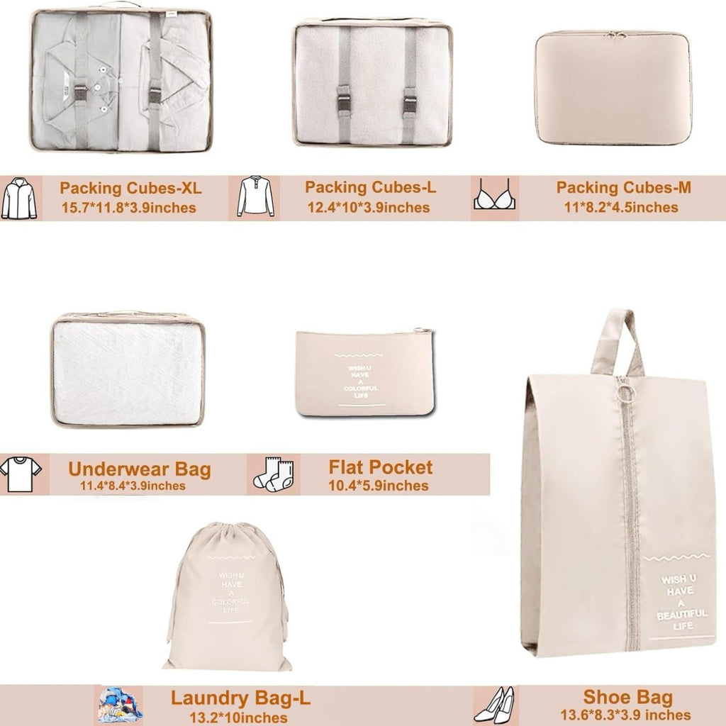 Brand: HLILaiColor: BeigeFeatures: Nylon Twill / Breathable Mesh Top 【7PC Set Large Capacity】4 sized packing cubes, 1x drawstring Bag, 1x shoe bag, 1x accessory bag, for essentials like jackets, shirts, shoes, pants, underwear, toiletries, and more. Laundry bag keeps soiled clothing separate. 【Premium Quality Travel Cubes】Mesh top panel, easy to...