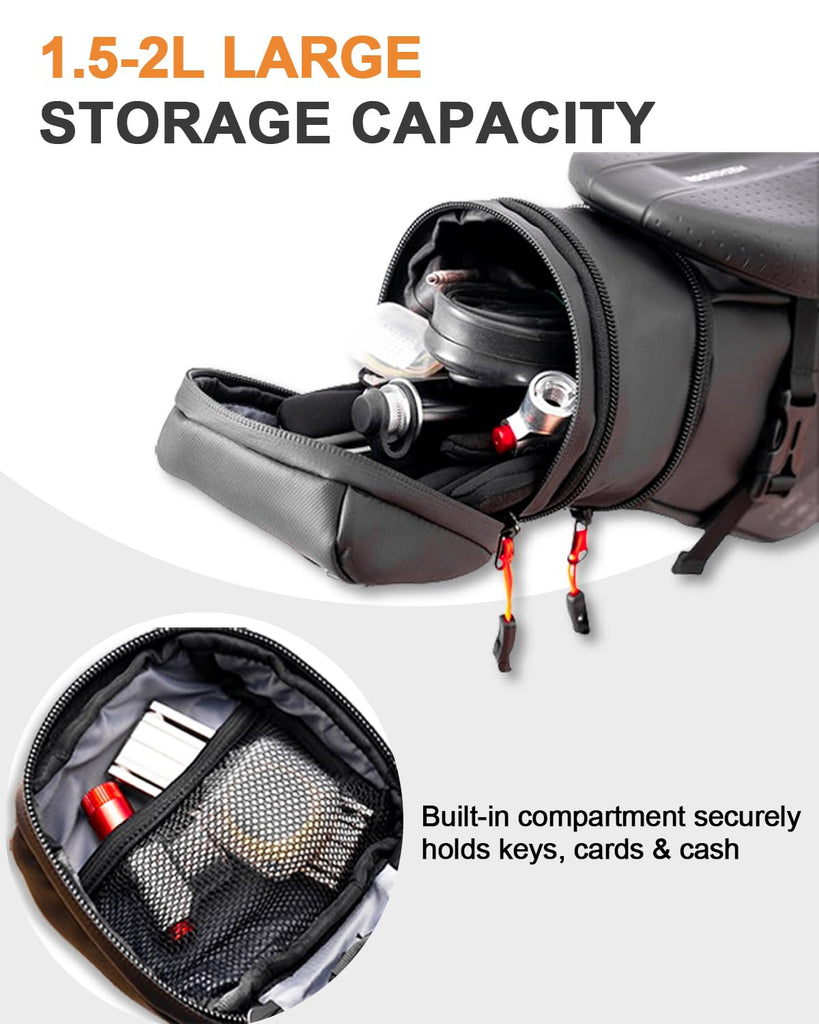 - MULTI-COMPARTMENT: The main compartment with built-in mesh pocket provides structured storage for essentials like keys, wallets, cycling gloves, phones, tire repair kits, and accessories. Smart compartment design ensures quick access during rides