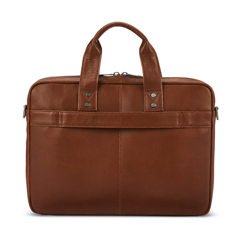 Crafted for the modern professional, this Samsonite Classic Leather Slim Briefcase in Cognac is a sleek and compact companion for your daily commute or travels. Measuring 11.25"H x 15.25"W x 2.25"D, it's designed to hold laptops up to 15.6 inches, ensuring your essentials are always within reach. The briefcase features a fully padded main compartment with a large slash pocket for files, tablets, and laptops, while the front zipper pocket boasts an organization panel with two phone pockets and pen pockets. The briefcase is made from top-grain leather, offering both sophistication and durability. It's equipped with a zipper closure, adjustable detachable strap with a nonslip shoulder pad, and a SmartSleeve for easy use while traveling. The briefcase is backed by a 3-year manufacturer limited warranty.