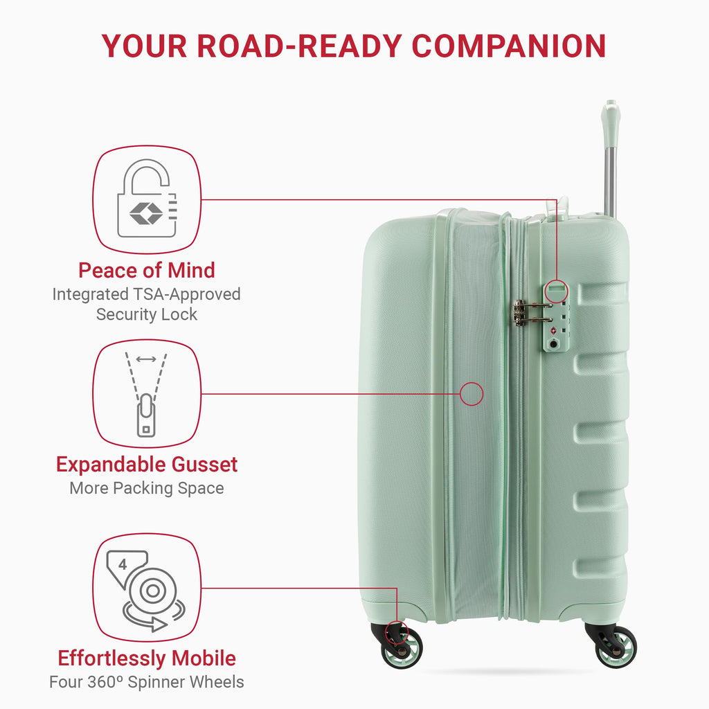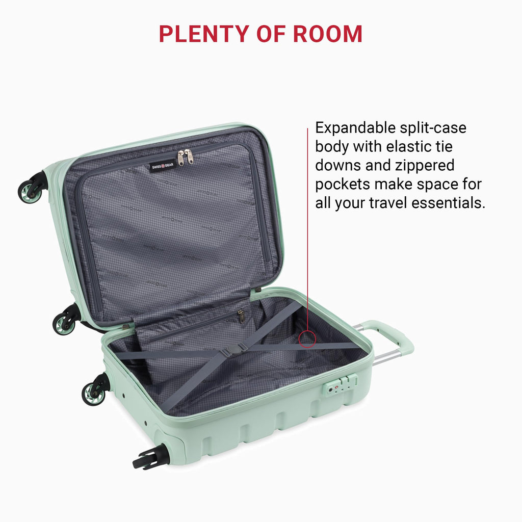 Experience ultimate convenience with the SwissGear Signature Hardside Expandable Carry-On with Cup Holder. Designed for frequent travelers, this 19-inch carry-on is made from durable ABS to withstand the wear and tear of travel. It features a split-case expandable design to maximize packing space while keeping belongings organized with multiple internal pockets. Equipped with eight 360-degree multi-directional spinner wheels and a push-button steel locking telescopic handle, this suitcase glides effortlessly through crowded airports. A unique built-in cup holder adds an extra level of convenience, allowing you to keep your beverage within reach while on the move. With outside dimensions of 22" x 14.25" x 10" and 19" x 14" x 10" of packing space, this compact yet spacious carry-on is ideal for short trips. Plus, it includes a 10-year warranty for peace of mind.