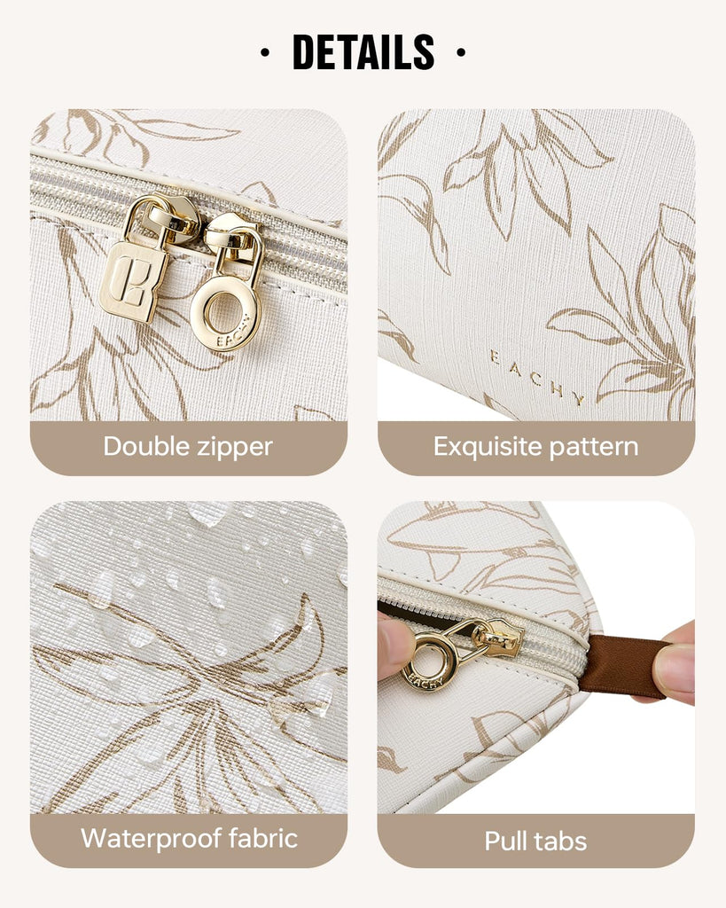 Brand: EACHYColor: AA-Beige-MFeatures: Smart-Organization Storage:Designed with multiple side pockets for small essentials, a transparent TPU brush pocket, and two separate cosmetic compartments, this cosmetic bag keeps cosmetics and toiletries neatly separated and easy to find. Full-Open Design:The flat-lay opening lets you unzip and view all items instantly. No more digging...