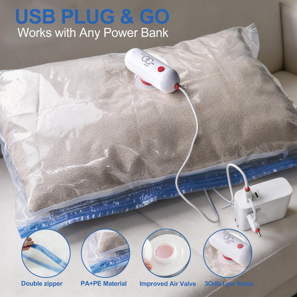 - USB Powered Vacuum Pump: Experience effortless compression wherever you go with our USB vacuum pump. Connect it to your mobile power supply or laptop for on-the-go compression