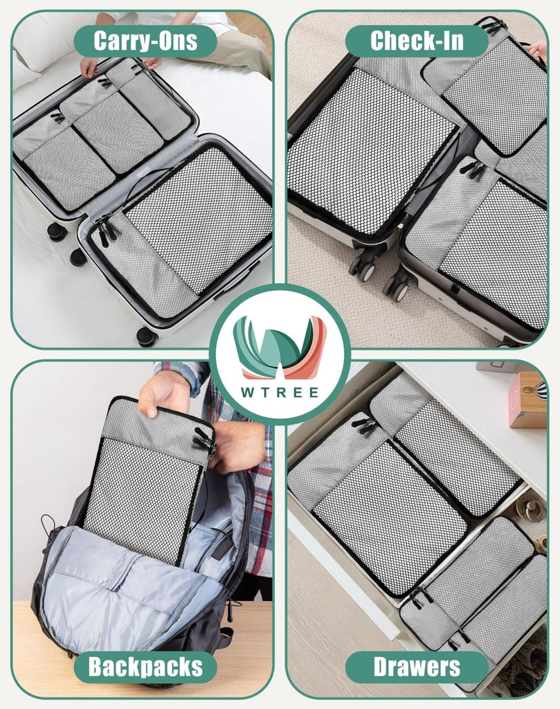 Brand: WTREEColor: GreyFeatures: Space-Saving & Travel-Friendly Design: Maximize your packing with our compact packing cubes, available in Small (11"L x 6"W x 3"H), Slim (14"L x 5"W x 3"H), Medium (14"L x 10"W x 3"H), and Large (18"L x 13"W x 3"H). Perfectly sized for suitcases, duffels, backpacks, or totes,...