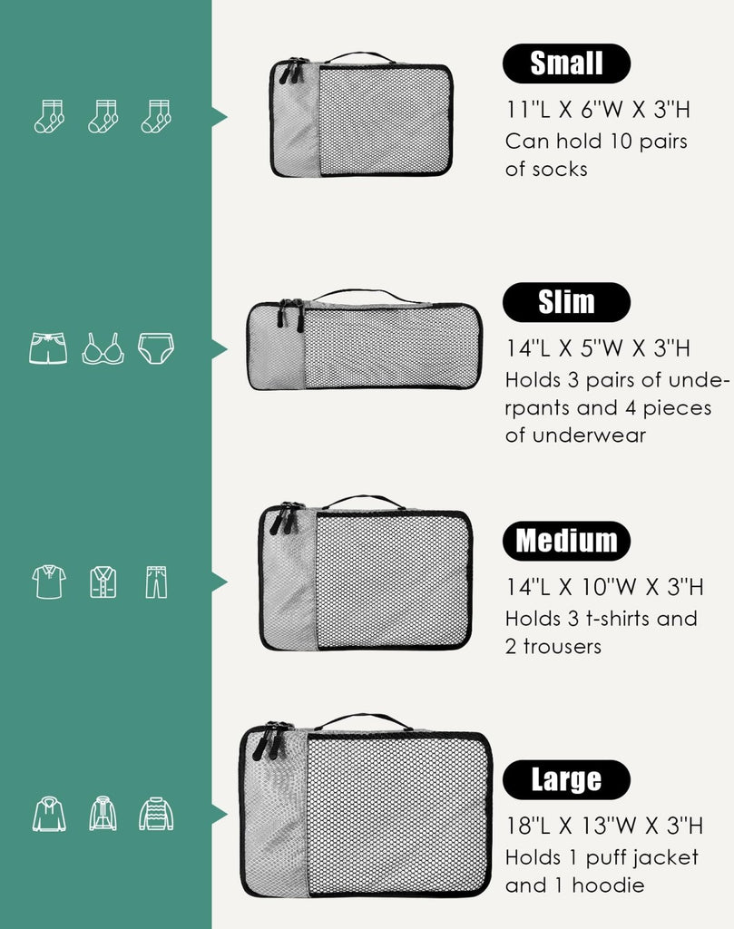 - Space-Saving & Travel-Friendly Design: Maximize your packing with our compact packing cubes, available in Small (11"L x 6"W x 3"H), Slim (14"L x 5"W x 3"H), Medium (14"L x 10"W x 3"H), and Large (18"L x 13"W x 3"H). Perfectly sized for suitcases, duffels, backpacks, or totes, they’re ideal for business trips, vacations, camping, or cruises. Use them at home to organize closets and keep essentials tidy and accessible.