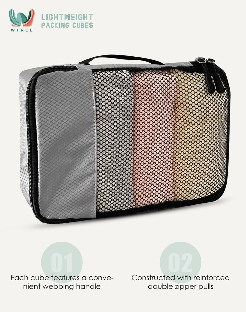 Details: WTREE 4-Piece Packing Cubes Travel Accessories Set for Suitcases - Luggage Organizer Bags with Double Zipper - Mesh Top - Small/Medium/Large/Slim - Grey
