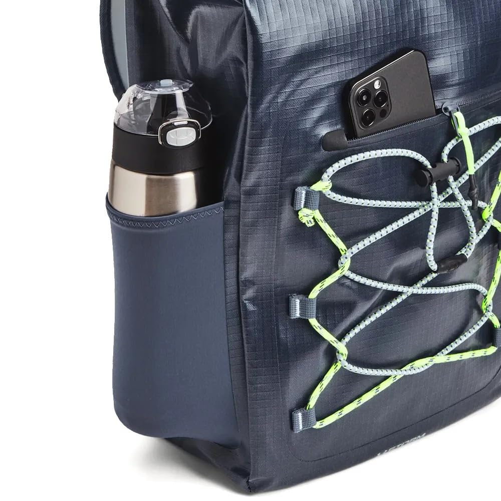 UA Storm technology delivers an element-battling, highly water-repellent finish LEVELED strap system guides you to assure straps are adjusted evenly for balanced weight distribution Padded, breathable air mesh back panel & shoulder straps for ultimate comfort Rolltop design with internal magnet & bungee strap closures Front zippered valuables pocket & 2 side water bottle pockets Adjustable front bungee for easily stashing a jacket, pair of shoes or ball Main body fabric contains at least 90% recycled polyester, excluding trims & embellishments Uses a fluorine-free water repellent treatment THIS ITEM IS NOT INTENDED FOR USE BY CHILDREN 12 AND UNDER