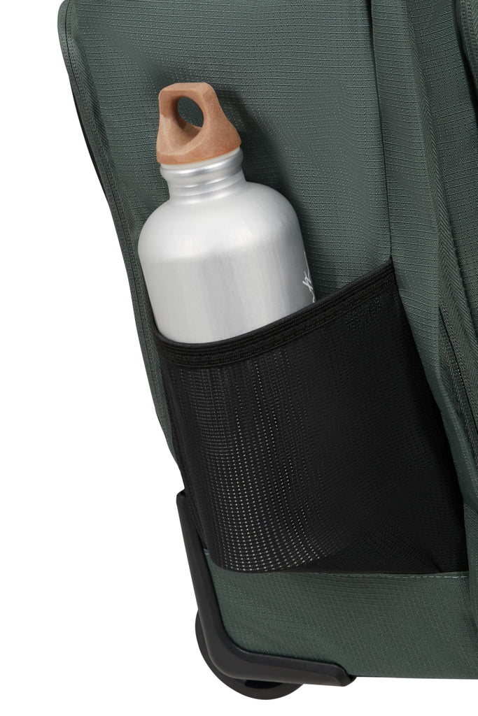 - CONVENIENCE & COMFORT Features include an elastic mesh side pocket for a water bottle, elastic cross straps that keep clothes securely in place, a smart sleeve for easy attachment to a duffle on wheels or suitcases, and a fully adjustable, lightweight monotube wheel handle for effortless rolling when upright