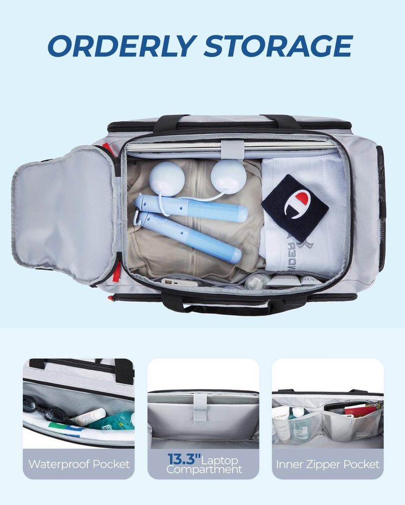 - Spacious & Multi-Compartments: The BAGSMART sports bag is designed to meet all your storage needs. With multiple compartments including a waterproof pocket, a 13.3" laptop compartment, and an inner zipper pocket, this gym bag keeps your belongings neatly arranged and easily accessible. Carry everything you need in one convenient and organized space. Dimensions:20.8×10.2×9.8 inches