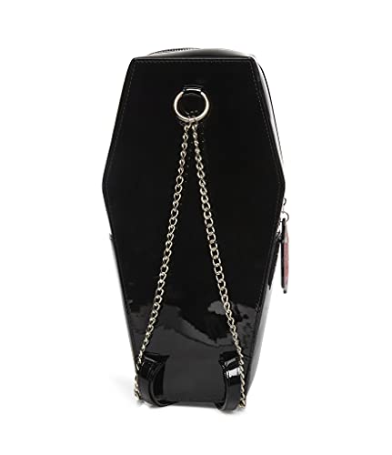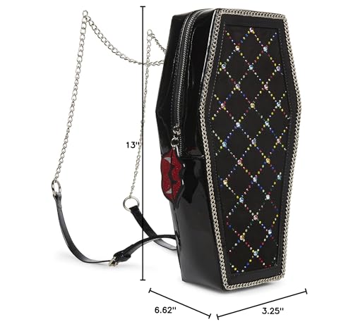 Brand: Betsey JohnsonColor: BlackFeatures: Adjustable back straps Glitter vampire lips zipper puller Multicolored rhinestones Zipper closure 6.625" L x 3.25" D x 13" H model number: BJ32245FPart Number: BJ32245FDetails: Description This kitch backpack is a major talking piece! It's shaped like a coffin and has multicolored stones. The zipper puller...