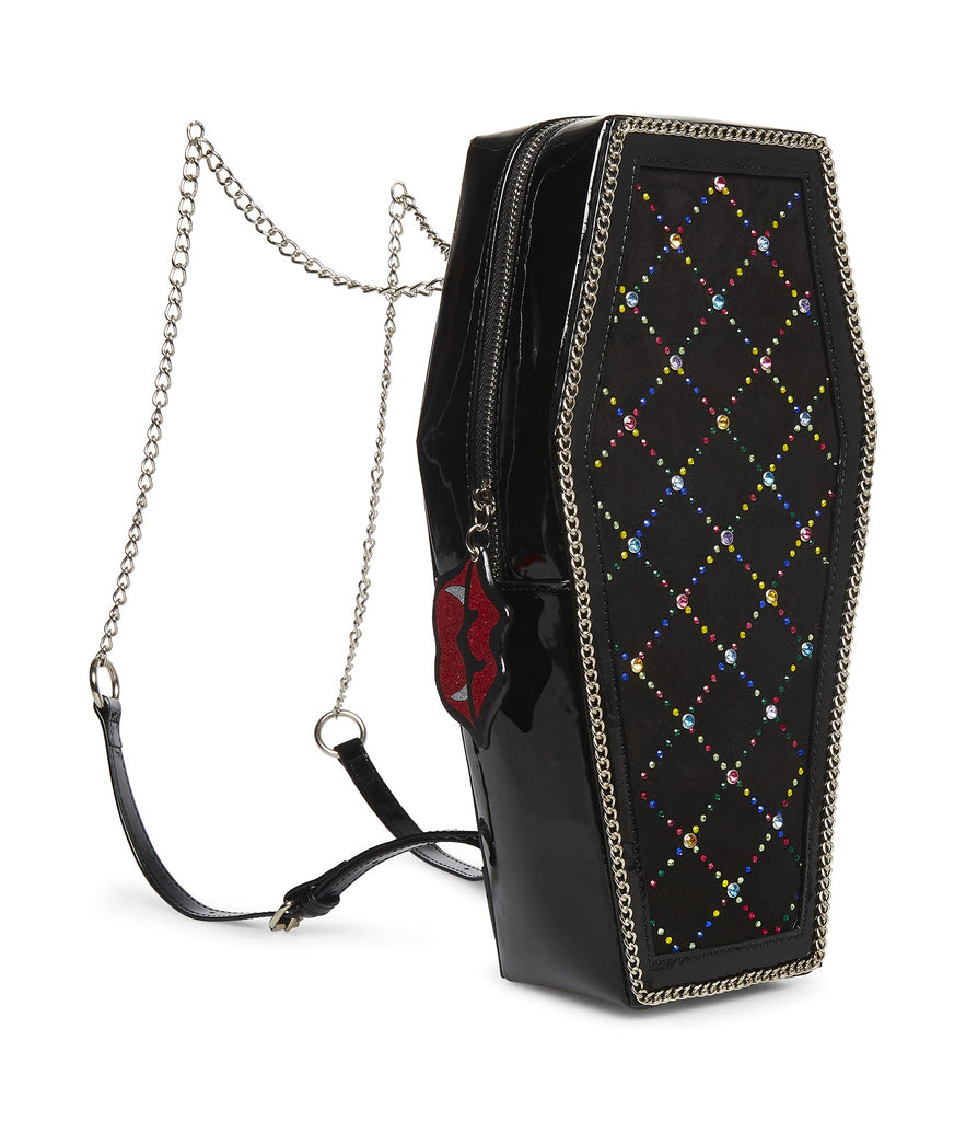 This kitch backpack is a major talking piece! It's shaped like a coffin and has multicolored stones. The zipper puller has glitter glampire lips.
