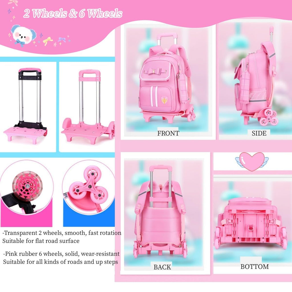 - Practical Rolling Backpack for Girls: You could use cute backpack with the trolley or remove the trolley if desired; the smooth wheels is easy to roll and not noisy; girls rolling backpack with lunch bag is fit for school; weekend travel; camping etc; it can be taken on planes and trains as a kids carry-on luggage